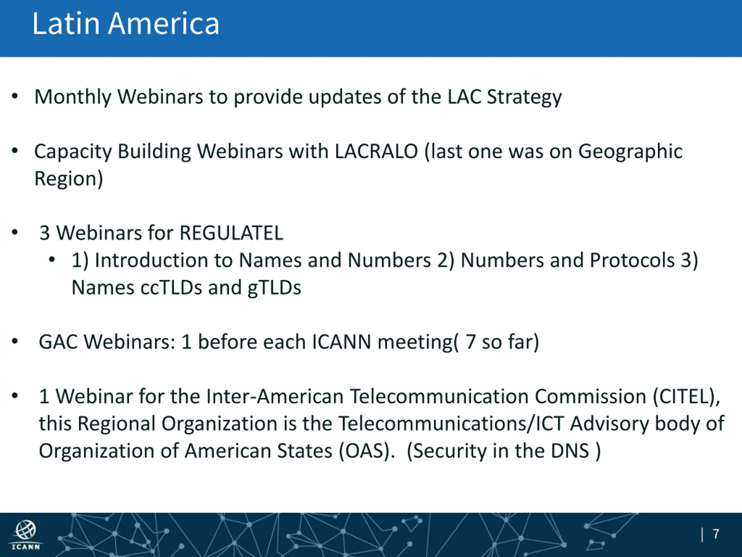 Latin America Monthly Webinars to provide updates of the LAC Strategy Capacity Building Webinars with LACRALO (last one was on Geographic Region) 3 Webinars for REGULATEL 1) Introduction to Names and Numbers 2) Numbers and Protocols 3) Names ccTLDs and gTLDs GAC Webinars: 1 before each ICANN meeting( 7 so far) 1 Webinar for the Inter-American Telecommunication Commission (CITEL), this Regional Organization is the Telecommunications/ICT Advisory body of Organization of American States (OAS). (Security in the DNS ) | 7
