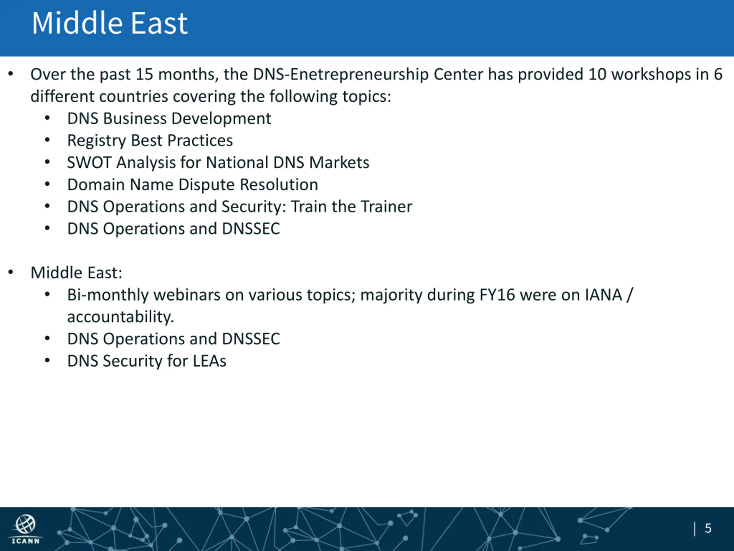 Middle East Over the past 15 months, the DNS-Enetrepreneurship Center has provided 10 workshops in 6 different countries covering the following topics: DNS Business Development Registry Best Practices SWOT Analysis for National DNS Markets Domain Name Dispute Resolution DNS Operations and Security: Train the Trainer DNS Operations and DNSSEC Middle East: Bi-monthly webinars on various topics; majority during FY16 were on IANA / accountability. DNS Operations and DNSSEC DNS Security for LEAs | 5
