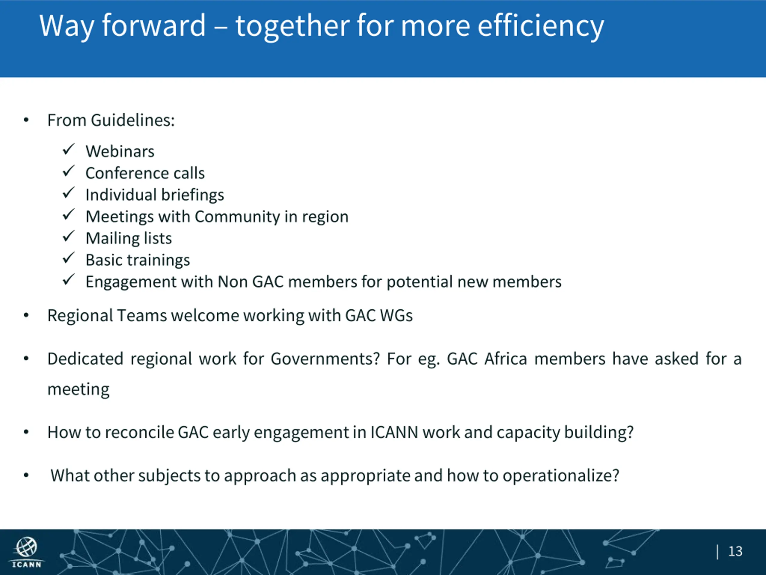 Way forward together for more efficiency From Guidelines: Webinars Conference calls Individual briefings Meetings with Community in region Mailing lists Basic trainings Engagement with Non GAC members for potential new members Regional Teams welcome working with GAC WGs Dedicated regional work for Governments? For eg. GAC Africa members have asked for a meeting How to reconcile GAC early engagement in ICANN work and capacity building? What other subjects to approach as appropriate and how to operationalize? | 13