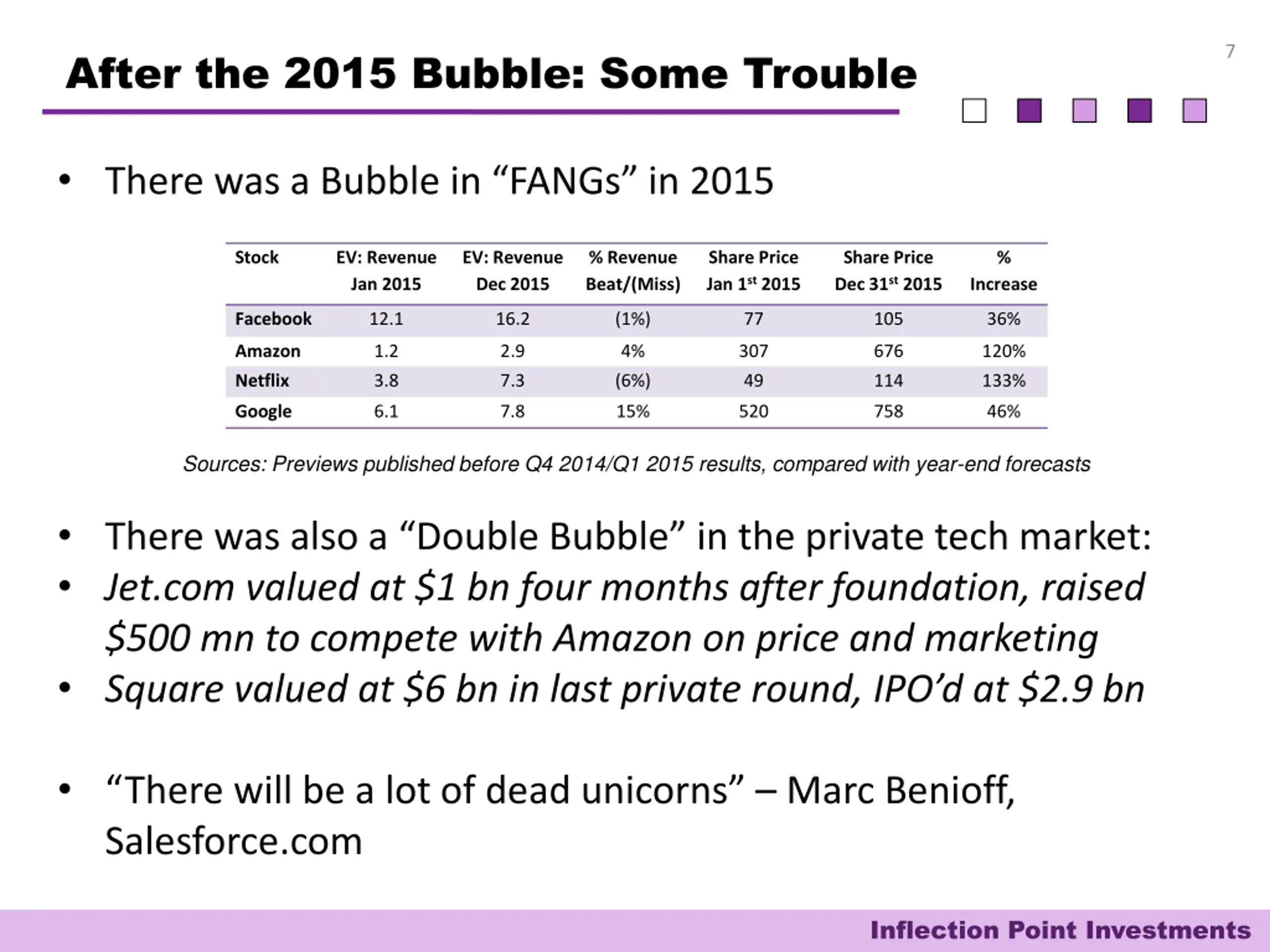After the 2015 Bubble: Some Trouble 7 There was a Bubble in FANGs in 2015 Stock EV: Revenue Jan 2015 EV: Revenue Dec 2015 % Revenue Beat/(Miss) Share Price Jan 1st 2015 Share Price Dec 31st 2015 % Increase Facebook 12.1 16.2 (1%) 77 105 36% Amazon 1.2 2.9 4% 307 676 120% Netflix 3.8 7.3 (6%) 49 114 133% Google 6.1 7.8 15% 520 758 46% Sources: Previews published before Q4 2014/Q1 2015 results, compared with year-end forecasts There was also a Double Bubble in the private tech market: Jet.com valued at $1 bn four months after foundation, raised $500 mn to compete with Amazon on price and marketing Square valued at $6 bn in last private round, IPO d at $2.9 bn There will be a lot of dead unicorns Marc Benioff, Salesforce.com Inflection Point Investments