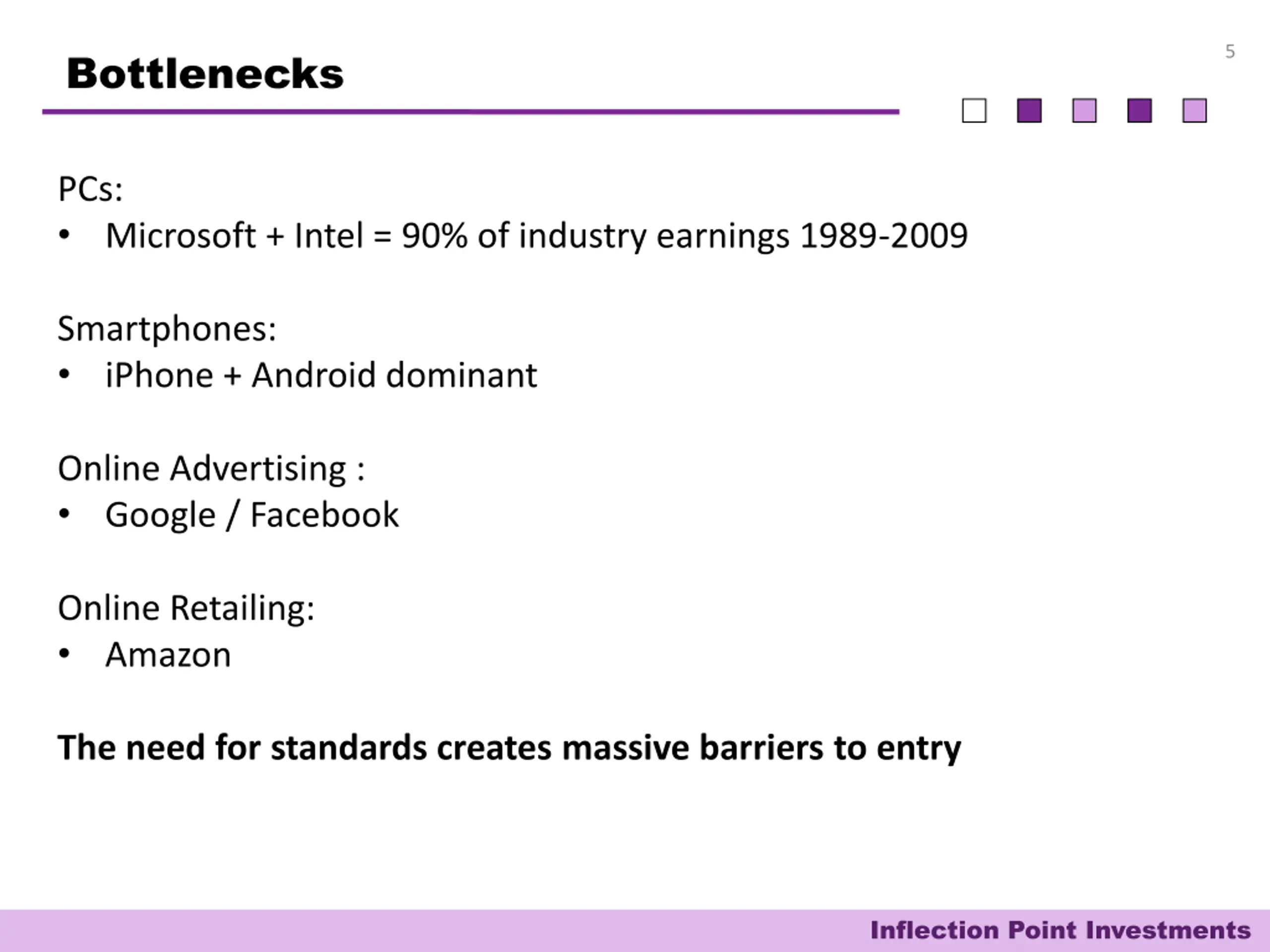 Bottlenecks 5 PCs: Microsoft + Intel = 90% of industry earnings 1989-2009 Smartphones: iPhone + Android dominant Online Advertising : Google / Facebook Online Retailing: Amazon The need for standards creates massive barriers to entry Inflection Point Investments
