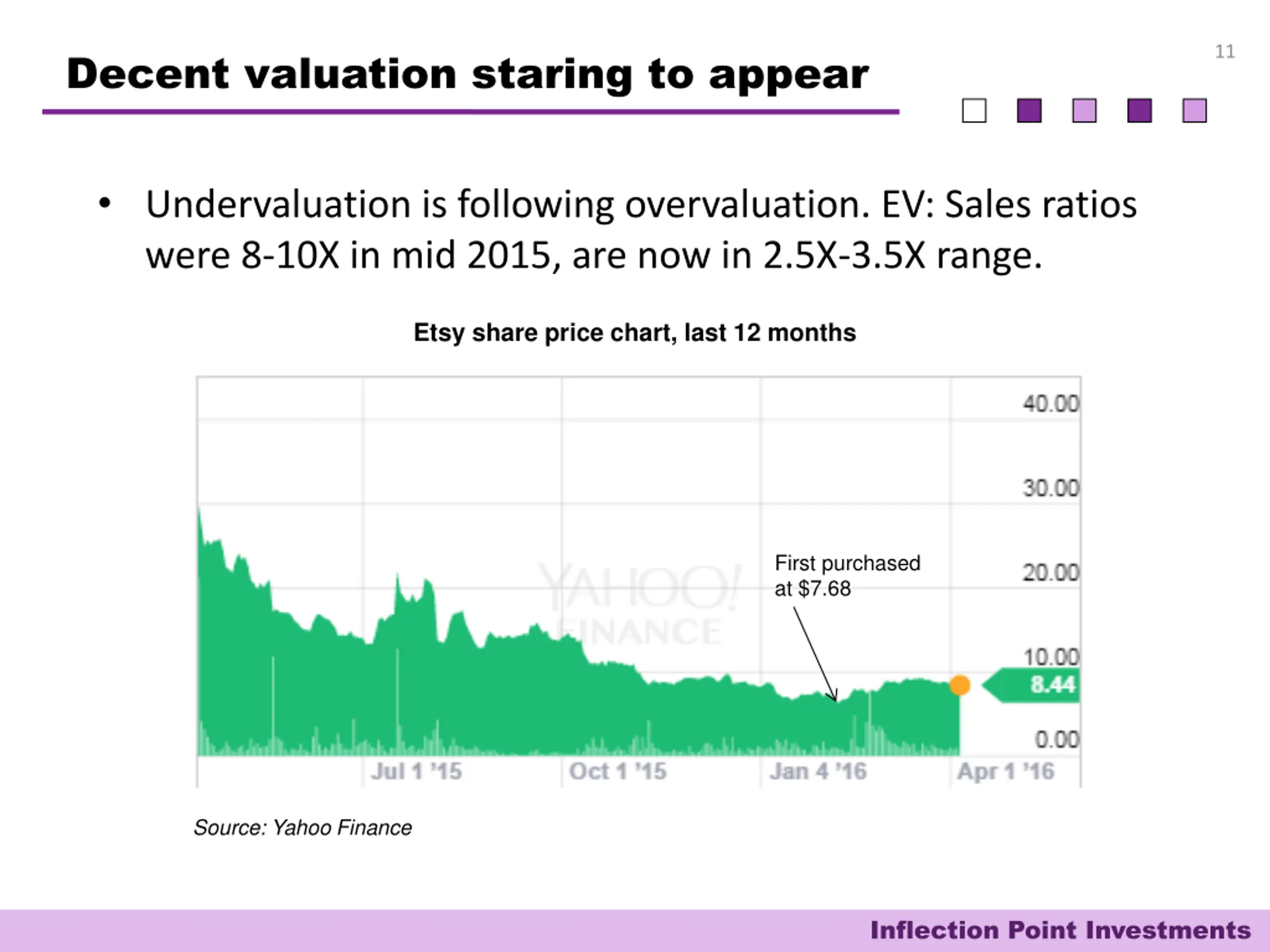 Decent valuation staring to appear 11 Undervaluation is following overvaluation. EV: Sales ratios were 8-10X in mid 2015, are now in 2.5X-3.5X range. Etsy share price chart, last 12 months First purchased at $7.68 Source: Yahoo Finance Inflection Point Investments