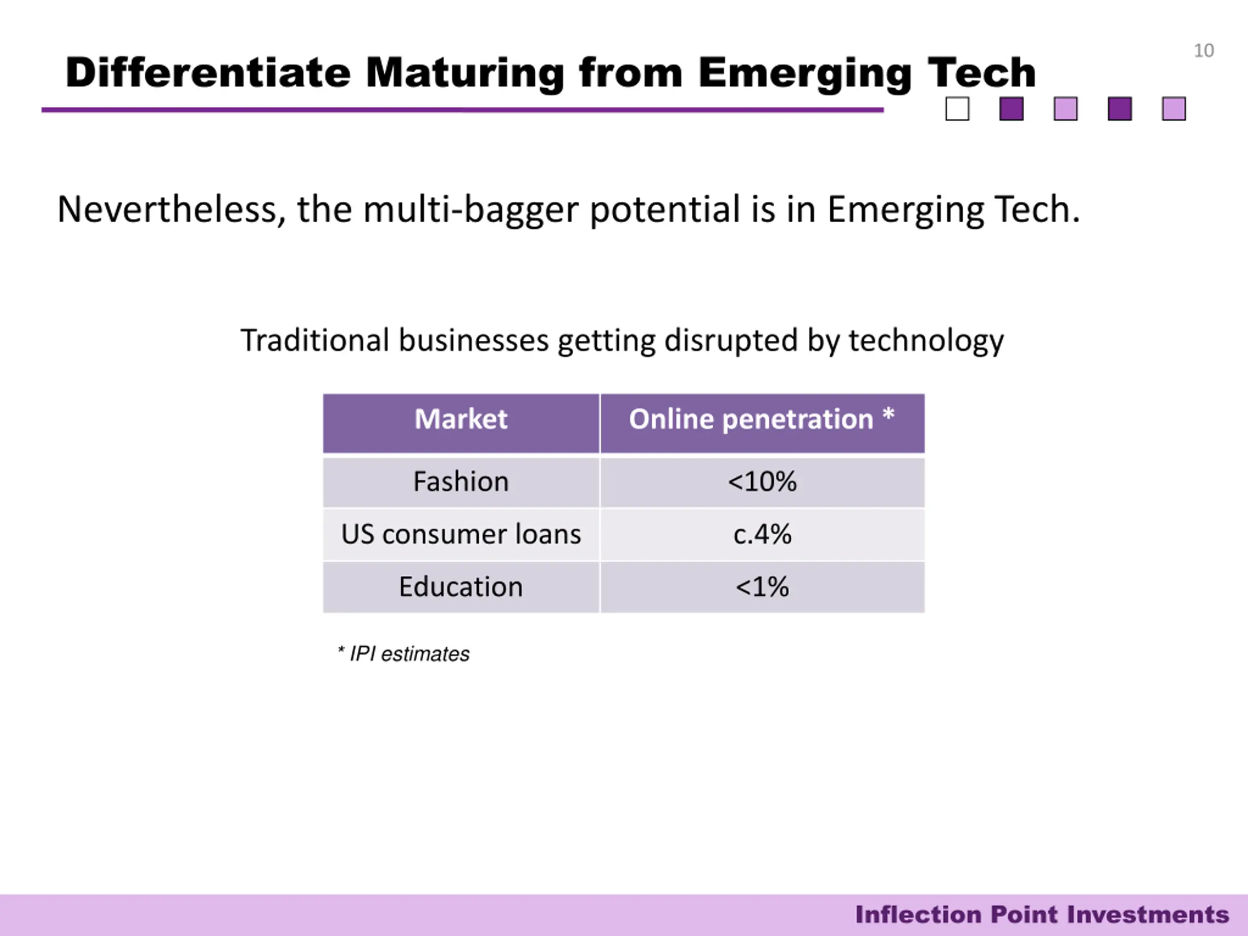 Differentiate Maturing from Emerging Tech 10 Nevertheless, the multi-bagger potential is in Emerging Tech. Traditional businesses getting disrupted by technology Market Online penetration * Fashion <10% US consumer loans c.4% Education <1% * IPI estimates Inflection Point Investments
