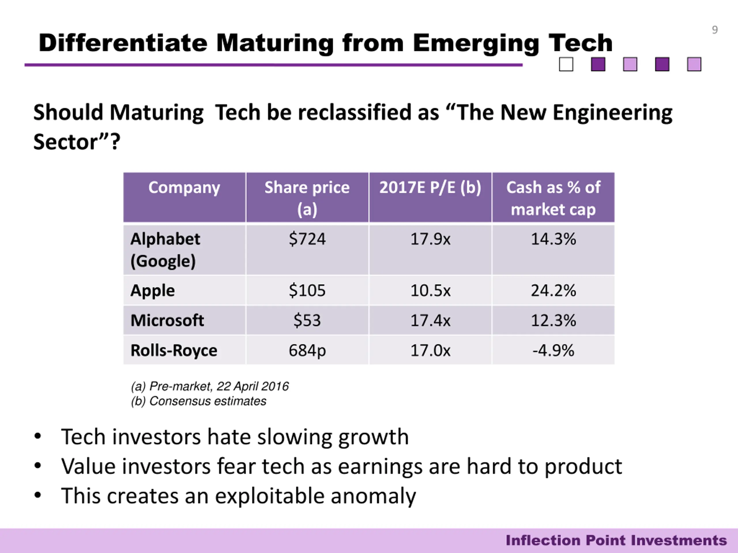 Differentiate Maturing from Emerging Tech 9 Should Maturing Tech be reclassified as The New Engineering Sector ? Company Share price (a) 2017E P/E (b) Cash as % of market cap Alphabet (Google) $724 17.9x 14.3% Apple $105 10.5x 24.2% Microsoft $53 17.4x 12.3% Rolls-Royce 684p 17.0x -4.9% (a) Pre-market, 22 April 2016 (b) Consensus estimates Tech investors hate slowing growth Value investors fear tech as earnings are hard to product This creates an exploitable anomaly Inflection Point Investments