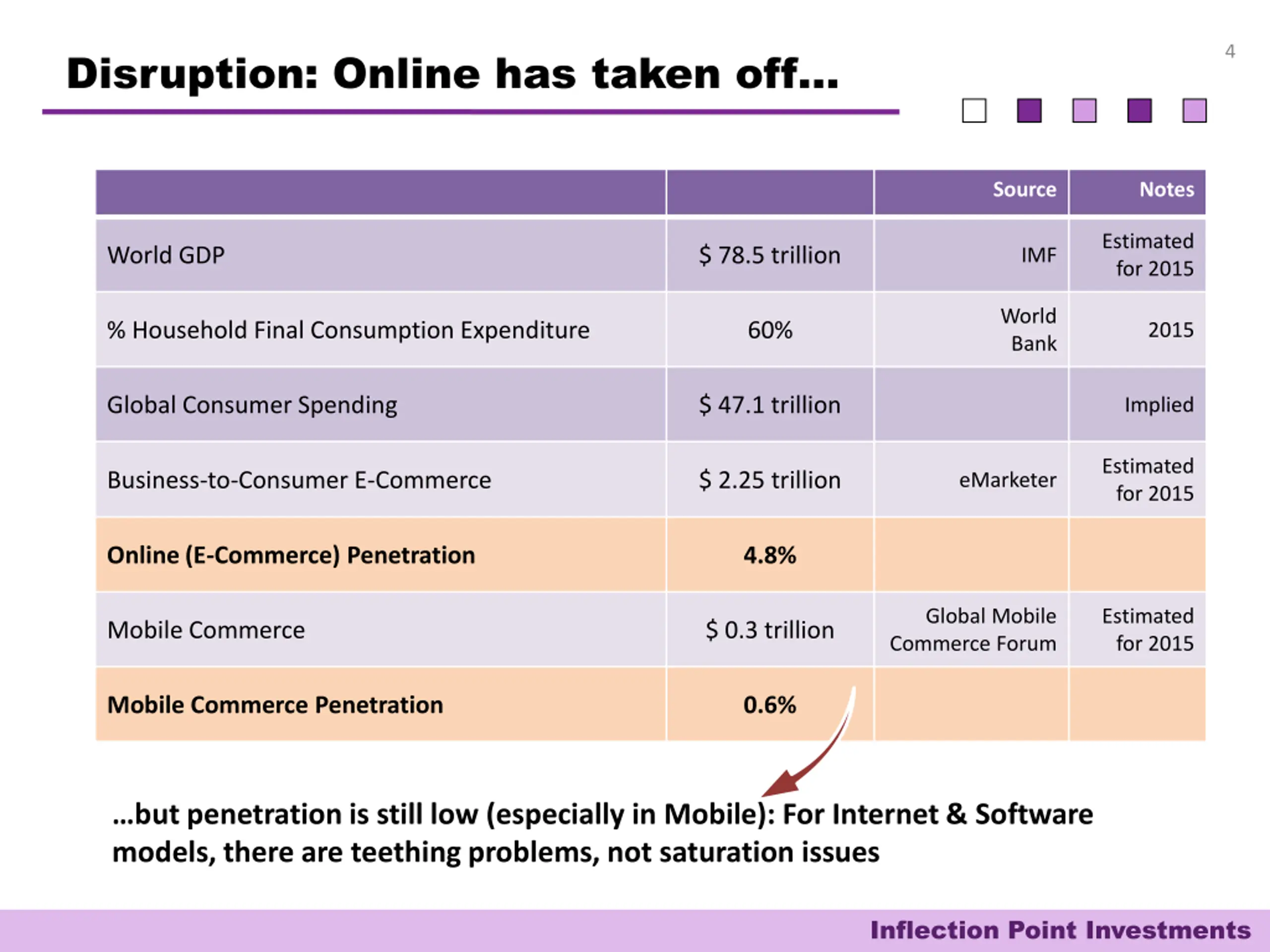 Disruption: Online has taken off 4 Source Notes Estimated for 2015 World GDP $ 78.5 trillion IMF World Bank % Household Final Consumption Expenditure 60% 2015 Global Consumer Spending $ 47.1 trillion Implied Estimated for 2015 Business-to-Consumer E-Commerce $ 2.25 trillion eMarketer Online (E-Commerce) Penetration 4.8% Global Mobile Commerce Forum Estimated for 2015 Mobile Commerce $ 0.3 trillion Mobile Commerce Penetration 0.6% but penetration is still low (especially in Mobile): For Internet & Software models, there are teething problems, not saturation issues Inflection Point Investments