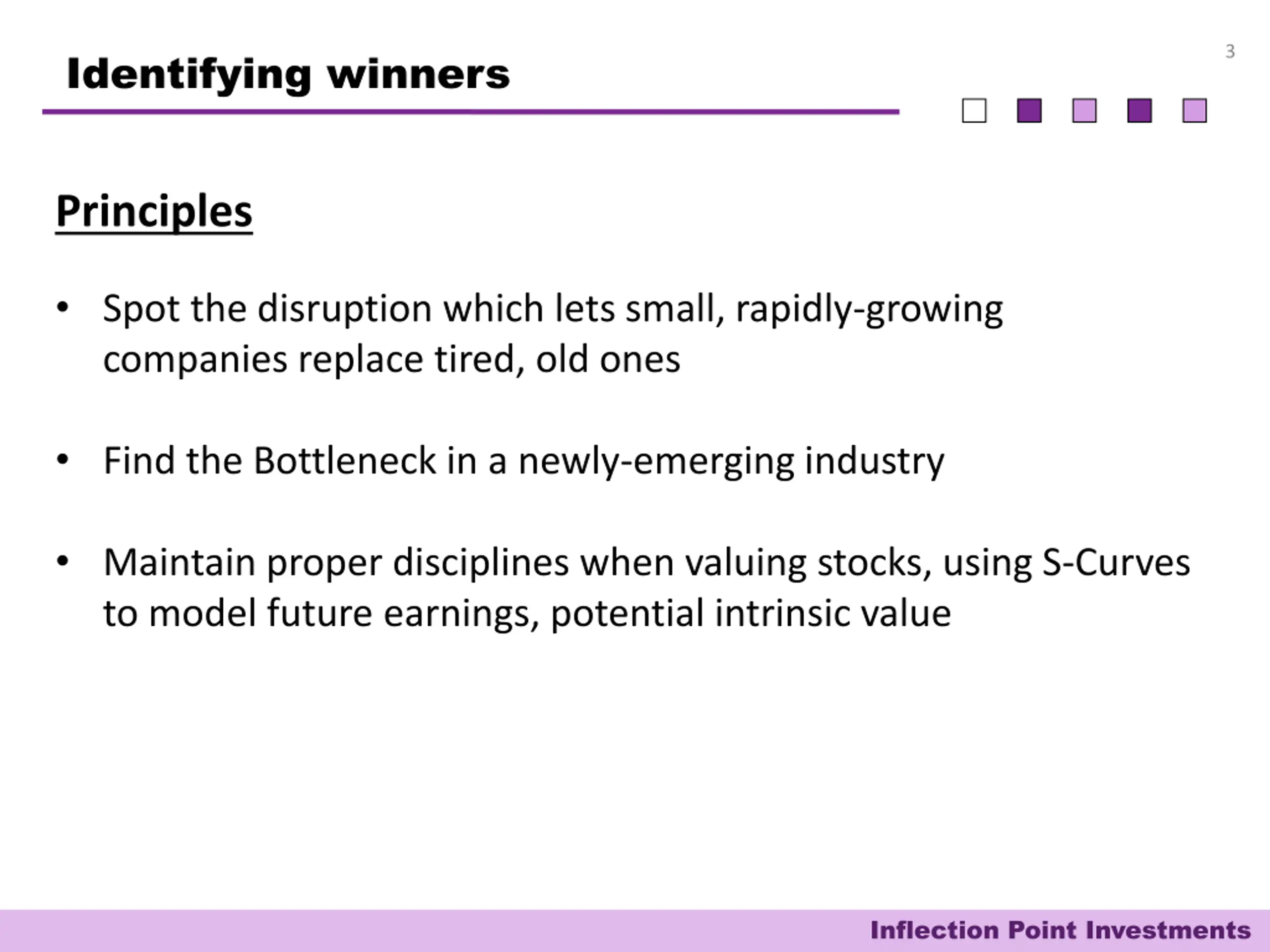 Identifying winners 3 Principles Spot the disruption which lets small, rapidly-growing companies replace tired, old ones Find the Bottleneck in a newly-emerging industry Maintain proper disciplines when valuing stocks, using S-Curves to model future earnings, potential intrinsic value Inflection Point Investments