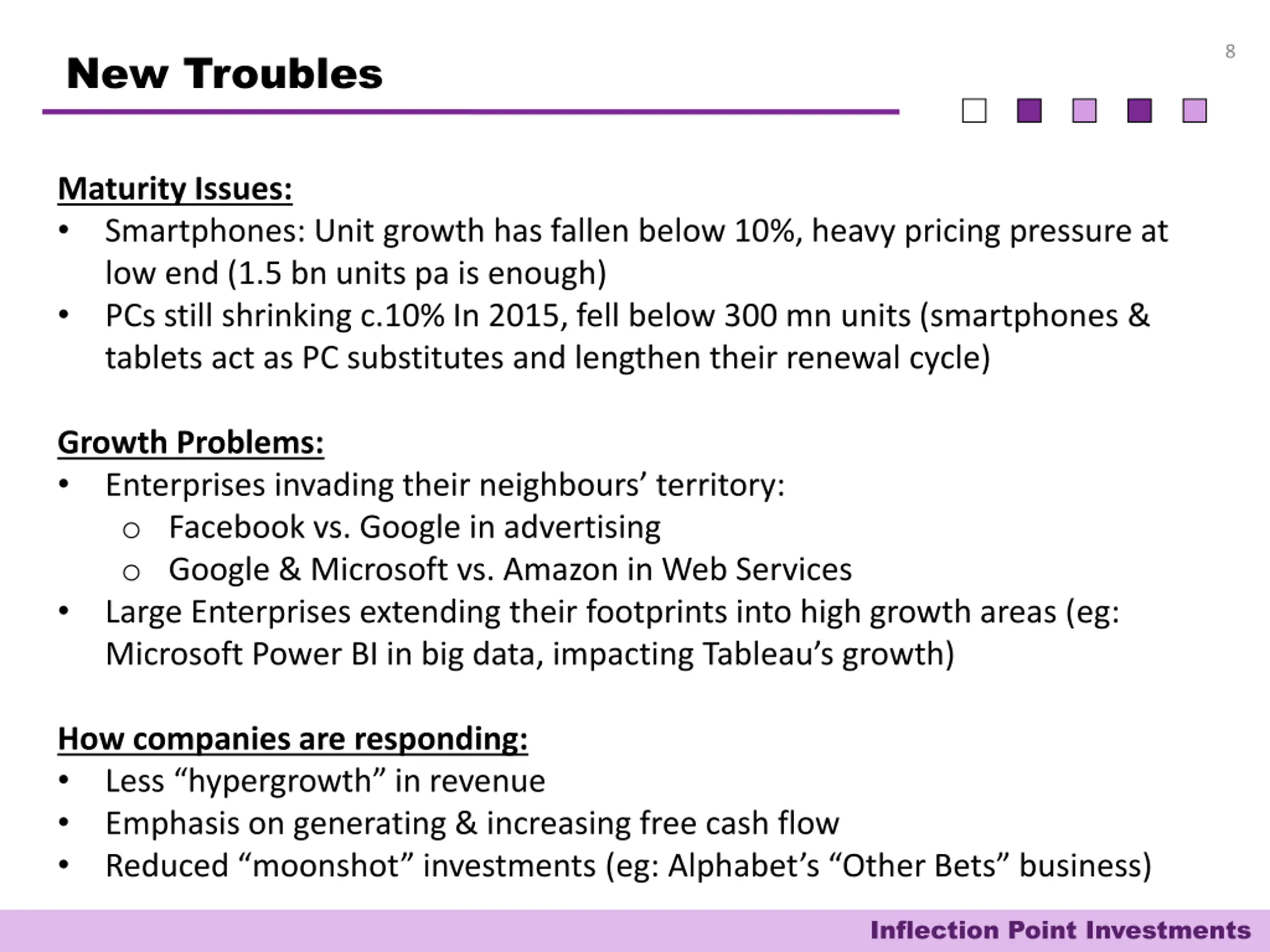 New Troubles 8 Maturity Issues: Smartphones: Unit growth has fallen below 10%, heavy pricing pressure at low end (1.5 bn units pa is enough) PCs still shrinking c.10% In 2015, fell below 300 mn units (smartphones & tablets act as PC substitutes and lengthen their renewal cycle) Growth Problems: Enterprises invading their neighbours territory: o Facebook vs. Google in advertising o Google & Microsoft vs. Amazon in Web Services Large Enterprises extending their footprints into high growth areas (eg: Microsoft Power BI in big data, impacting Tableau s growth) How companies are responding: Less hypergrowth in revenue Emphasis on generating & increasing free cash flow Reduced moonshot investments (eg: Alphabet s Other Bets business) Inflection Point Investments