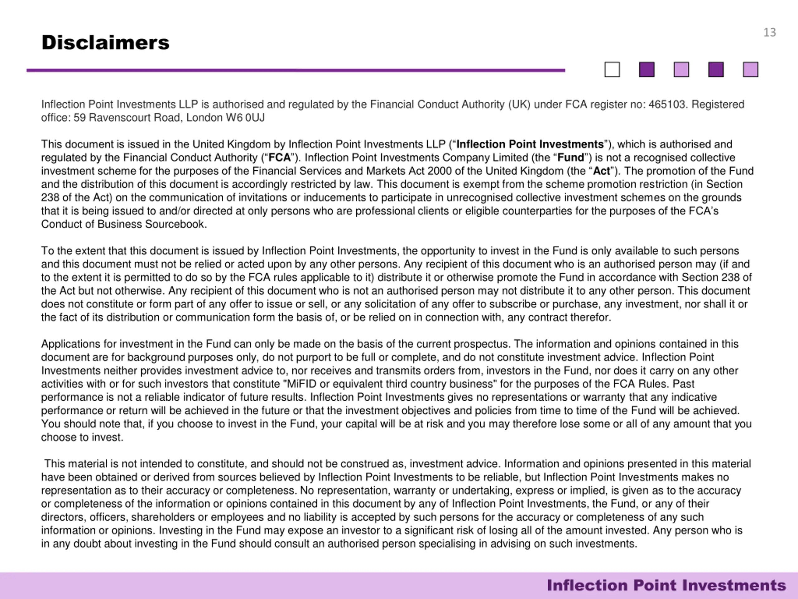 13 Disclaimers Inflection Point Investments LLP is authorised and regulated by the Financial Conduct Authority (UK) under FCA register no: 465103. Registered office: 59 Ravenscourt Road, London W6 0UJ This document is issued in the United Kingdom by Inflection Point Investments LLP ( Inflection Point Investments ), which is authorised and regulated by the Financial Conduct Authority ( FCA ). Inflection Point Investments Company Limited (the Fund ) is not a recognised collective investment scheme for the purposes of the Financial Services and Markets Act 2000 of the United Kingdom (the Act ). The promotion of the Fund and the distribution of this document is accordingly restricted by law. This document is exempt from the scheme promotion restriction (in Section 238 of the Act) on the communication of invitations or inducements to participate in unrecognised collective investment schemes on the grounds that it is being issued to and/or directed at only persons who are professional clients or eligible counterparties for the purposes of the FCA s Conduct of Business Sourcebook. To the extent that this document is issued by Inflection Point Investments, the opportunity to invest in the Fund is only available to such persons and this document must not be relied or acted upon by any other persons. Any recipient of this document who is an authorised person may (if and to the extent it is permitted to do so by the FCA rules applicable to it) distribute it or otherwise promote the Fund in accordance with Section 238 of the Act but not otherwise. Any recipient of this document who is not an authorised person may not distribute it to any other person. This document does not constitute or form part of any offer to issue or sell, or any solicitation of any offer to subscribe or purchase, any investment, nor shall it or the fact of its distribution or communication form the basis of, or be relied on in connection with, any contract therefor. Applications for investment in the Fund can only be made on the basis of the current prospectus. The information and opinions contained in this document are for background purposes only, do not purport to be full or complete, and do not constitute investment advice. Inflection Point Investments neither provides investment advice to, nor receives and transmits orders from, investors in the Fund, nor does it carry on any other activities with or for such investors that constitute "MiFID or equivalent third country business" for the purposes of the FCA Rules. Past performance is not a reliable indicator of future results. Inflection Point Investments gives no representations or warranty that any indicative performance or return will be achieved in the future or that the investment objectives and policies from time to time of the Fund will be achieved. You should note that, if you choose to invest in the Fund, your capital will be at risk and you may therefore lose some or all of any amount that you choose to invest. This material is not intended to constitute, and should not be construed as, investment advice. Information and opinions presented in this material have been obtained or derived from sources believed by Inflection Point Investments to be reliable, but Inflection Point Investments makes no representation as to their accuracy or completeness. No representation, warranty or undertaking, express or implied, is given as to the accuracy or completeness of the information or opinions contained in this document by any of Inflection Point Investments, the Fund, or any of their directors, officers, shareholders or employees and no liability is accepted by such persons for the accuracy or completeness of any such information or opinions. Investing in the Fund may expose an investor to a significant risk of losing all of the amount invested. Any person who is in any doubt about investing in the Fund should consult an authorised person specialising in advising on such investments. Inflection Point Investments