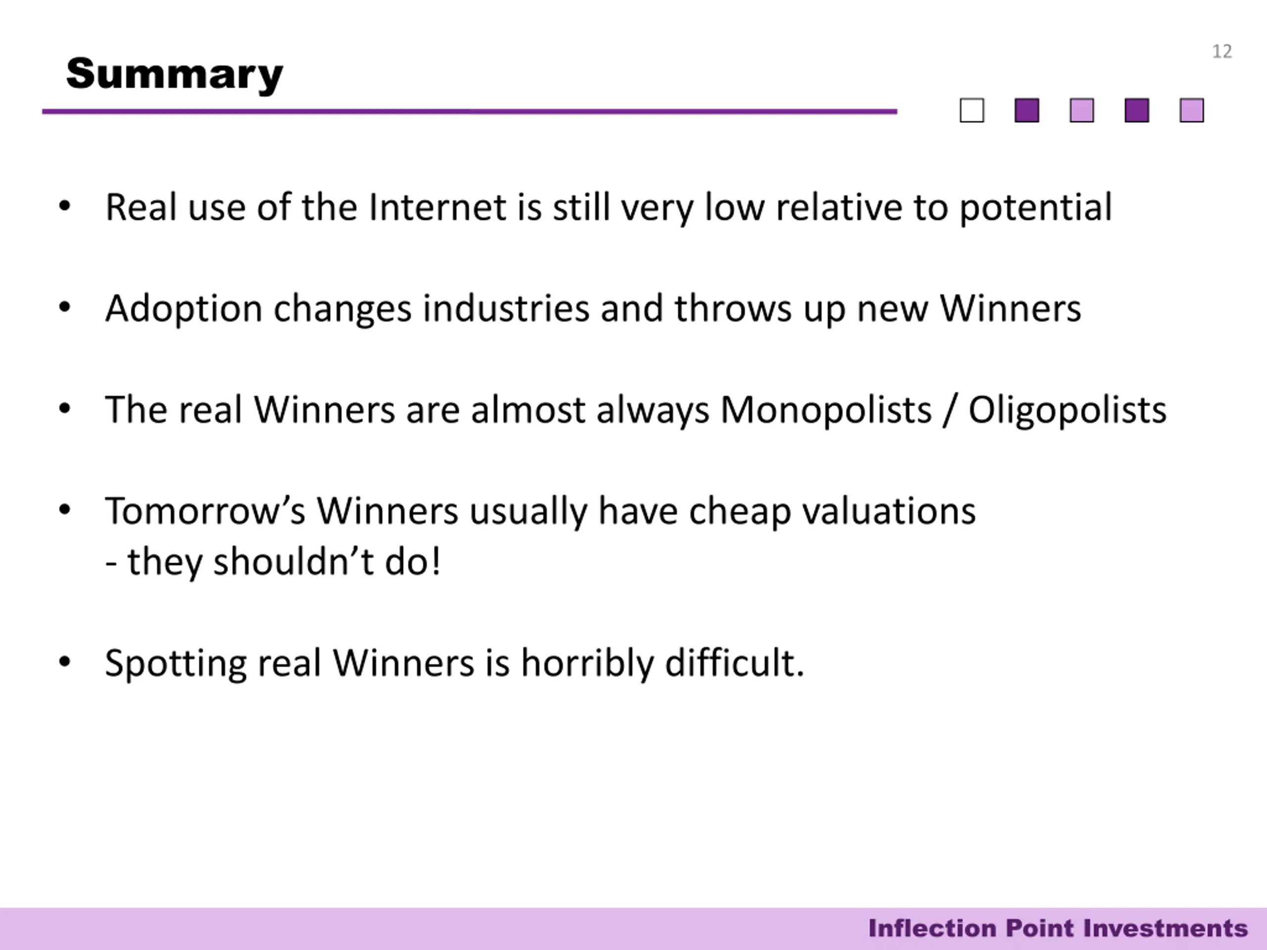 Summary 12 Real use of the Internet is still very low relative to potential Adoption changes industries and throws up new Winners The real Winners are almost always Monopolists / Oligopolists Tomorrow s Winners usually have cheap valuations - they shouldn t do! Spotting real Winners is horribly difficult. Inflection Point Investments