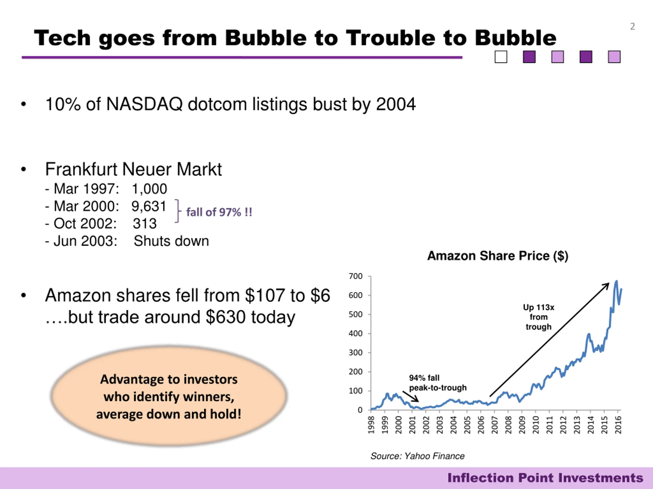 Tech goes from Bubble to Trouble to Bubble 2 10% of NASDAQ dotcom listings bust by 2004 Frankfurt Neuer Markt - Mar 1997: 1,000 - Mar 2000: 9,631 - Oct 2002: 313 - Jun 2003: Shuts down fall of 97% !! Amazon Share Price ($) 700 Amazon shares fell from $107 to $6 .but trade around $630 today 600 Up 113x from trough 500 400 300 200 Advantage to investors who identify winners, average down and hold! 94% fall peak-to-trough 100 0 1998 1999 2000 2001 2002 2003 2004 2005 2006 2007 2008 2009 2010 2011 2012 2013 2014 2015 2016 Source: Yahoo Finance Inflection Point Investments