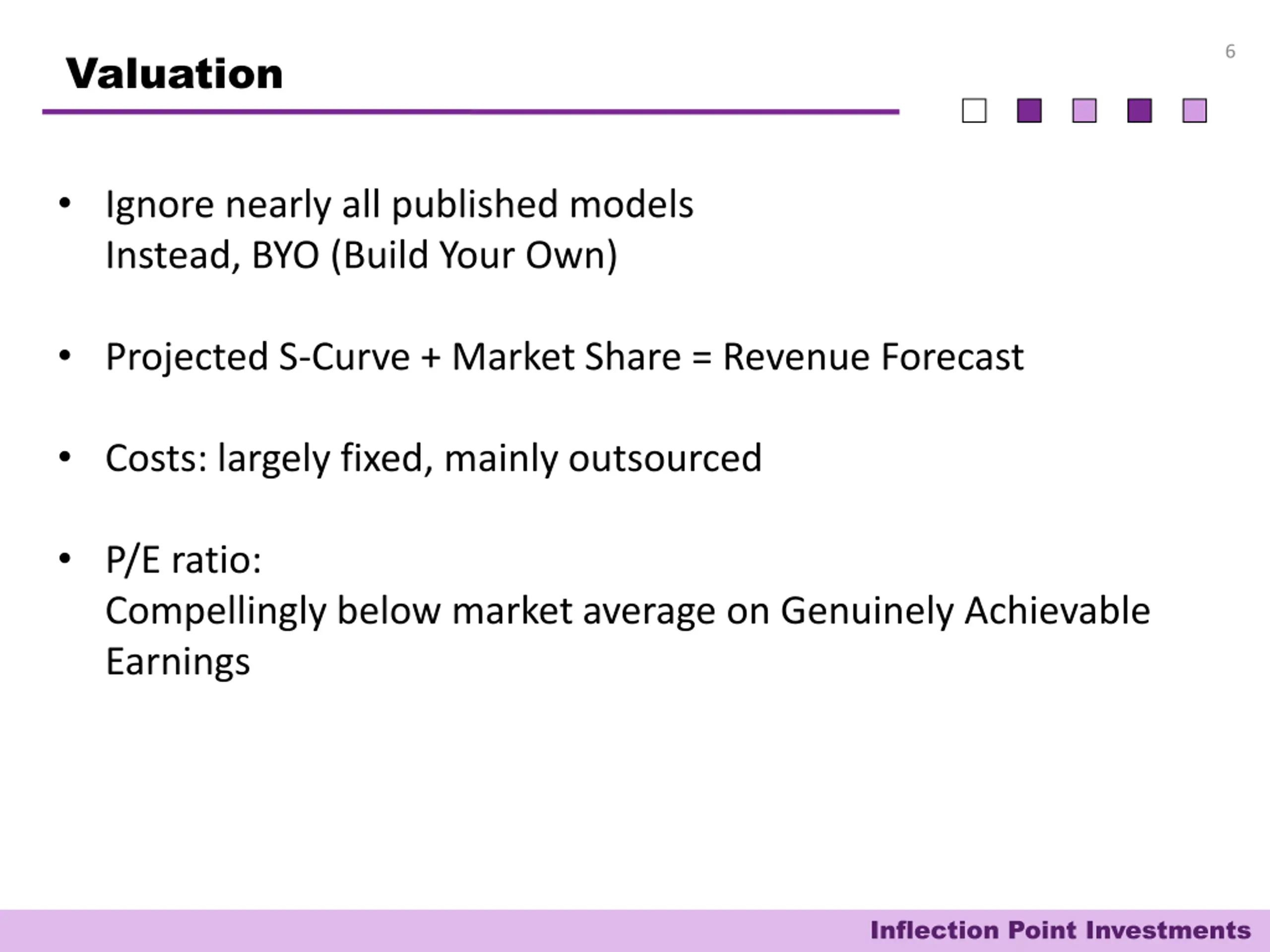 Valuation 6 Ignore nearly all published models Instead, BYO (Build Your Own) Projected S-Curve + Market Share = Revenue Forecast Costs: largely fixed, mainly outsourced P/E ratio: Compellingly below market average on Genuinely Achievable Earnings Inflection Point Investments