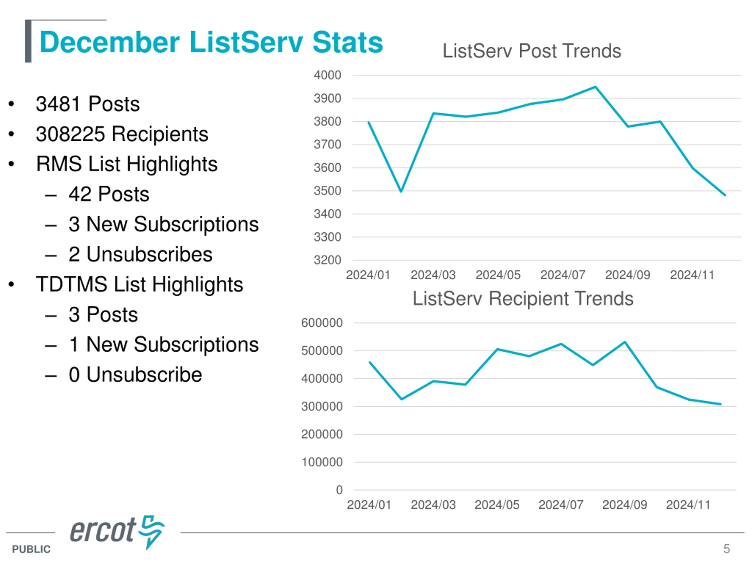 December ListServ Stats ListServ Post Trends 4000 3900 3481 Posts 308225 Recipients RMS List Highlights 42 Posts 3 New Subscriptions 2 Unsubscribes TDTMS List Highlights 3 Posts 1 New Subscriptions 0 Unsubscribe 3800 3700 3600 3500 3400 3300 3200 2024/01 2024/03 2024/05 2024/07 2024/09 2024/11 ListServ Recipient Trends 600000 500000 400000 300000 200000 100000 0 2024/01 2024/03 2024/05 2024/07 2024/09 2024/11 5 PUBLIC