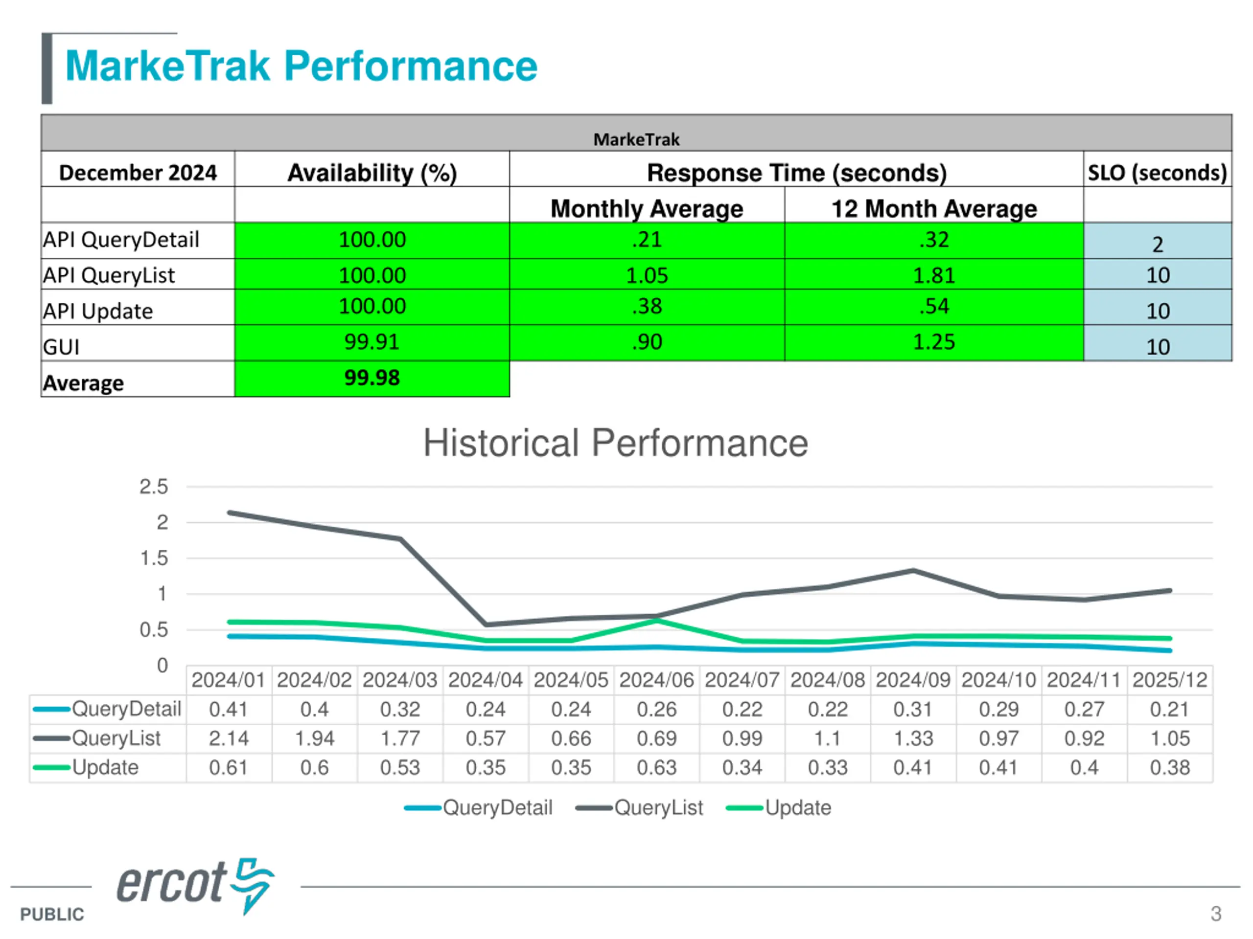Incident Report Highlights Service Availability December 2024 Retail Market IT systems met all SLA targets. Market Data Transparency IT systems met all SLA targets. Retail Incidents & Maintenance December 2024 12/15 Retail Release Non-Retail Incidents & Maintenance December 2024 12/11-12/12 Application Release ListServ Incidents & Maintenance December 2024 No activities SLA Documents and Incident Reporting https://www.ercot.com/services/sla/ 2 PUBLIC