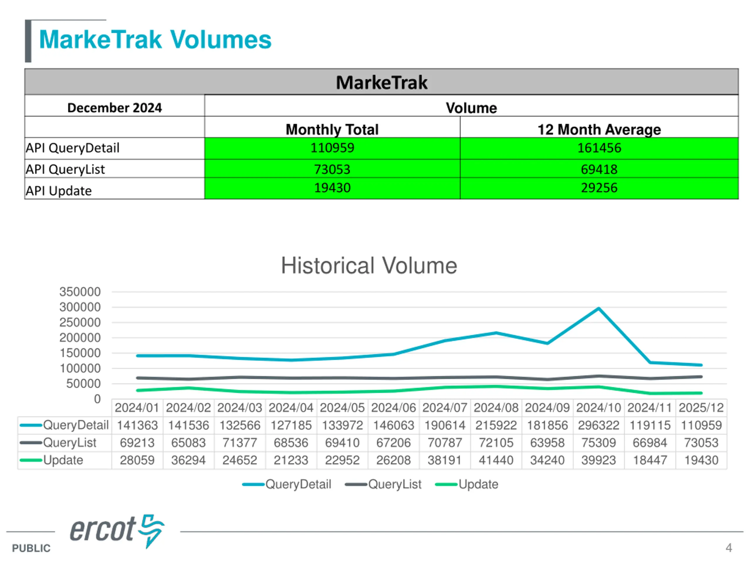 MarkeTrak Volumes MarkeTrak Volume December 2024 Monthly Total 110959 73053 19430 12 Month Average 161456 69418 29256 API QueryDetail API QueryList API Update Historical Volume 350000 300000 250000 200000 150000 100000 50000 0 2024/01 2024/02 2024/03 2024/04 2024/05 2024/06 2024/07 2024/08 2024/09 2024/10 2024/11 2025/12 QueryDetail 141363 141536 132566 127185 133972 146063 190614 215922 181856 296322 119115 110959 QueryList 69213 65083 71377 68536 69410 67206 Update 28059 36294 24652 21233 22952 26208 70787 38191 72105 41440 63958 34240 75309 39923 66984 18447 73053 19430 QueryDetail QueryList Update 4 PUBLIC