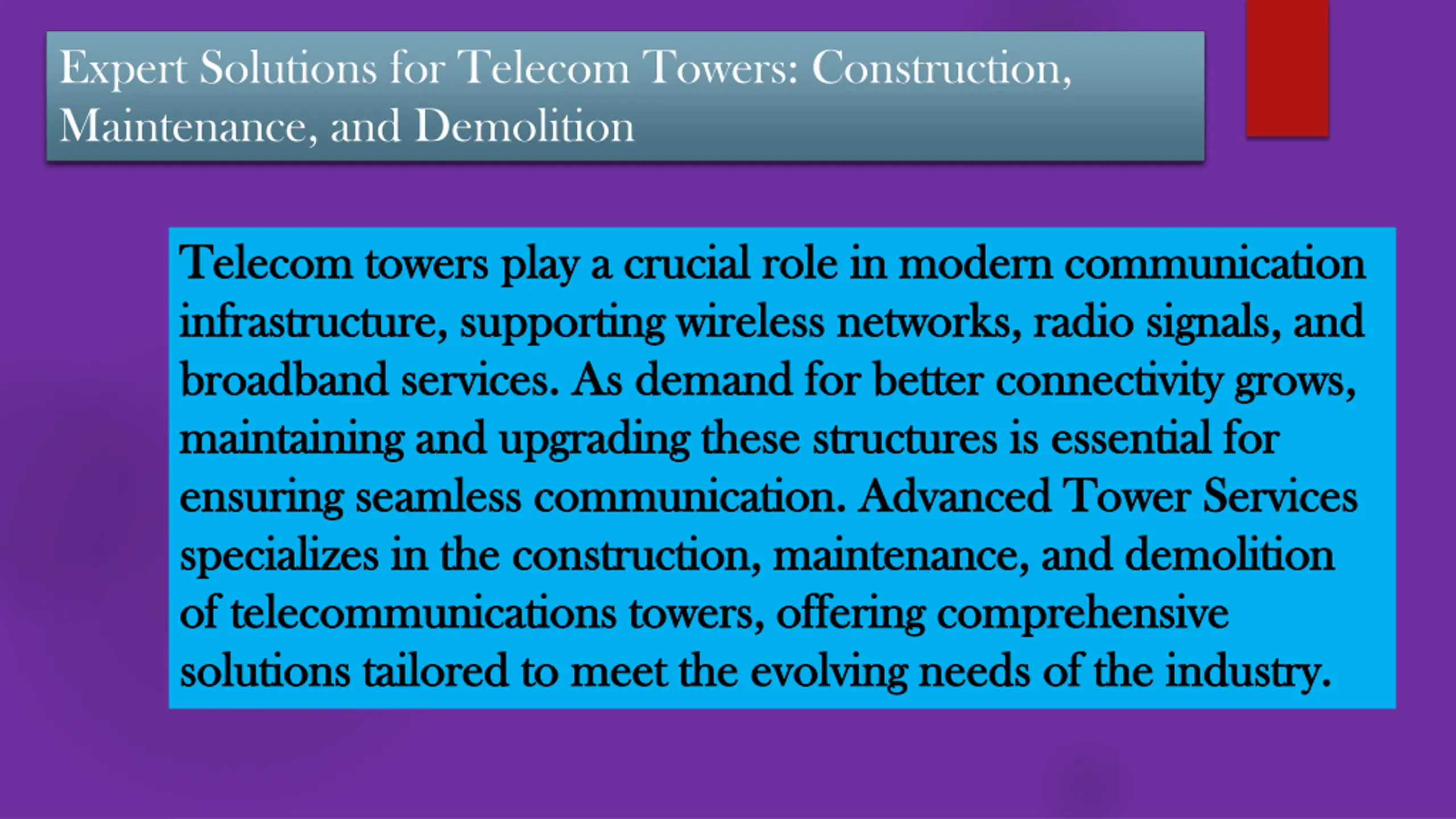 Expert Solutions for Telecom Towers: Construction, Maintenance, and Demolition Telecom towers play a crucial role in modern communication Telecom towers play a crucial role in modern communication infrastructure, supporting wireless networks, radio signals, and infrastructure, supporting wireless networks, radio signals, and broadband services. As demand for better connectivity grows, broadband services. As demand for better connectivity grows, maintaining and upgrading these structures is essential for maintaining and upgrading these structures is essential for ensuring seamless communication. Advanced Tower Services ensuring seamless communication. Advanced Tower Services specializes in the construction, maintenance, and demolition specializes in the construction, maintenance, and demolition of telecommunications towers, offering comprehensive of telecommunications towers, offering comprehensive solutions tailored to meet the evolving needs of the industry. solutions tailored to meet the evolving needs of the industry.