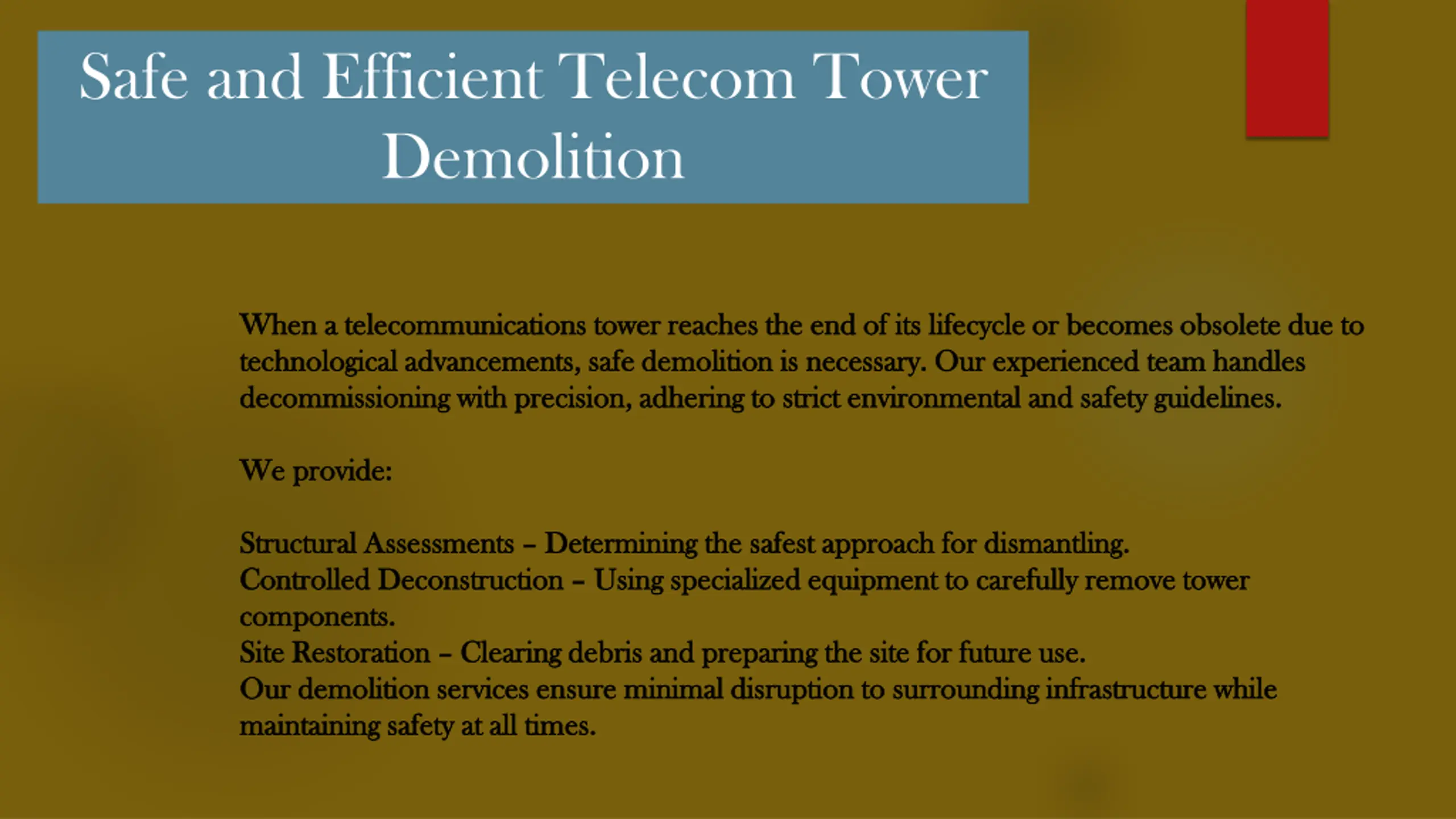 Safe and Efficient Telecom Tower Demolition When a telecommunications tower reaches the end of its lifecycle or becomes obsolete due to When a telecommunications tower reaches the end of its lifecycle or becomes obsolete due to technological advancements, safe demolition is necessary. Our experienced team handles technological advancements, safe demolition is necessary. Our experienced team handles decommissioning with precision, adhering to strict environmental and safety guidelines. decommissioning with precision, adhering to strict environmental and safety guidelines. We provide: We provide: Structural Assessments Structural Assessments Determining the safest approach for dismantling. Determining the safest approach for dismantling. Controlled Deconstruction Controlled Deconstruction Using specialized equipment to carefully remove tower Using specialized equipment to carefully remove tower components. components. Site Restoration Site Restoration Clearing debris and preparing the site for future use. Clearing debris and preparing the site for future use. Our demolition services ensure minimal disruption to surrounding infrastructure while Our demolition services ensure minimal disruption to surrounding infrastructure while maintaining safety at all times. maintaining safety at all times.