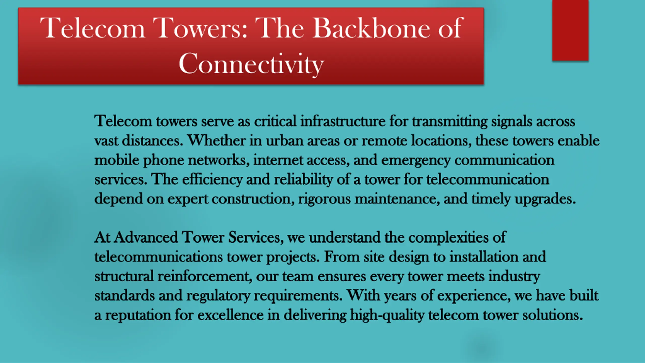Telecom Towers: The Backbone of Connectivity Telecom towers serve as critical infrastructure for transmitting signals across Telecom towers serve as critical infrastructure for transmitting signals across vast distances. Whether in urban areas or remote locations, these towers enable vast distances. Whether in urban areas or remote locations, these towers enable mobile phone networks, internet access, and emergency communication mobile phone networks, internet access, and emergency communication services. The efficiency and reliability of a tower for telecommunication services. The efficiency and reliability of a tower for telecommunication depend on expert construction, rigorous maintenance, and timely upgrades. depend on expert construction, rigorous maintenance, and timely upgrades. At Advanced Tower Services, we understand the complexities of At Advanced Tower Services, we understand the complexities of telecommunications tower projects. From site design to installation and telecommunications tower projects. From site design to installation and structural reinforcement, our team ensures every tower meets industry structural reinforcement, our team ensures every tower meets industry standards and regulatory requirements. With years of experience, we have built standards and regulatory requirements. With years of experience, we have built a reputation for excellence in delivering high a reputation for excellence in delivering high- -quality telecom tower solutions. quality telecom tower solutions.