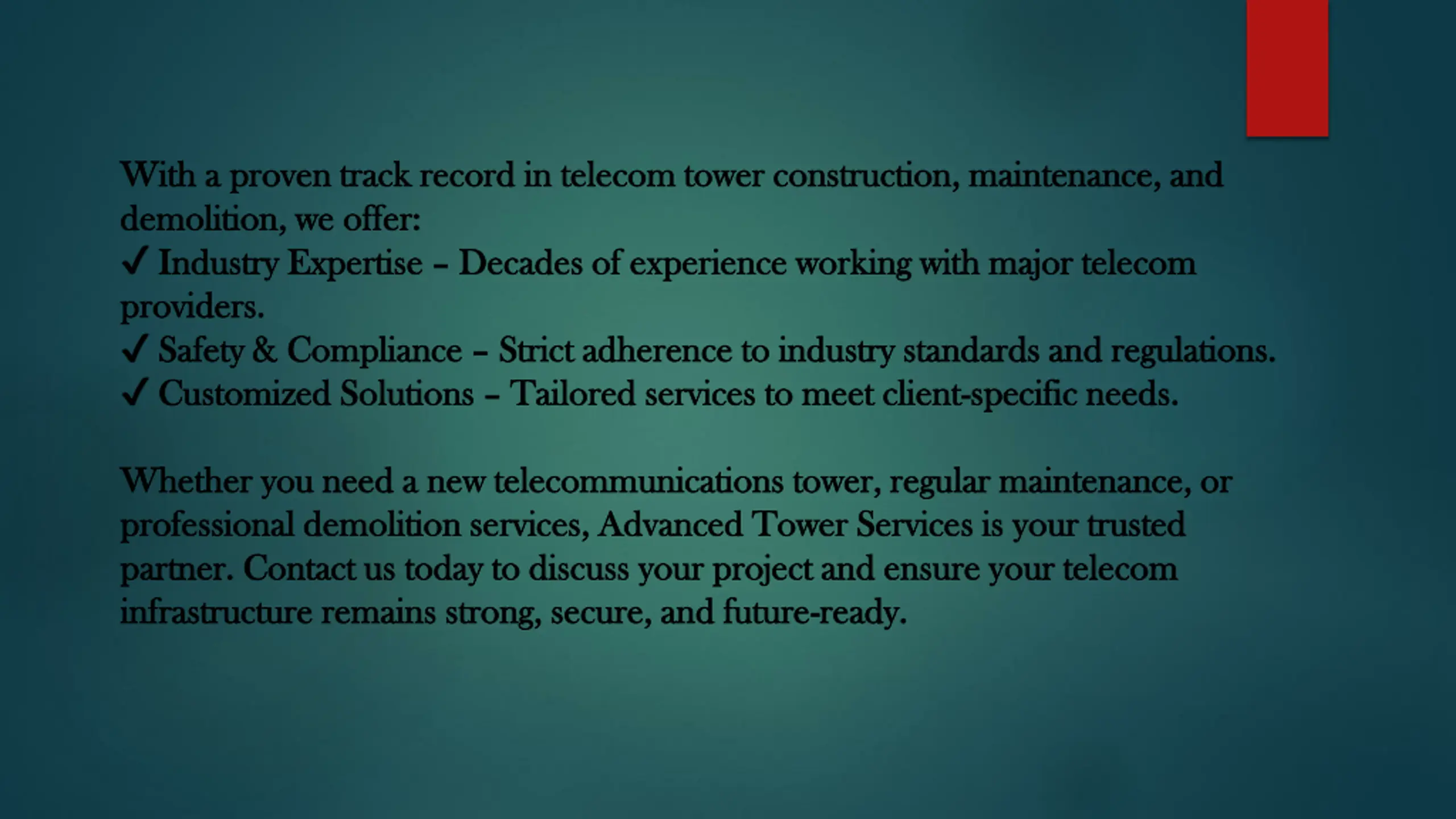 With a proven track record in telecom tower construction, maintenance, and With a proven track record in telecom tower construction, maintenance, and demolition, we offer: demolition, we offer: Industry Expertise Industry Expertise Decades of experience working with major telecom Decades of experience working with major telecom providers. providers. Safety & Compliance Safety & Compliance Strict adherence to industry standards and regulations. Strict adherence to industry standards and regulations. Customized Solutions Customized Solutions Tailored services to meet client Tailored services to meet client- -specific needs. specific needs. Whether you need a new telecommunications tower, regular maintenance, or Whether you need a new telecommunications tower, regular maintenance, or professional demolition services, Advanced Tower Services is your trusted professional demolition services, Advanced Tower Services is your trusted partner. Contact us today to discuss your project and ensure your telecom partner. Contact us today to discuss your project and ensure your telecom infrastructure remains strong, secure, and future infrastructure remains strong, secure, and future- -ready. ready.