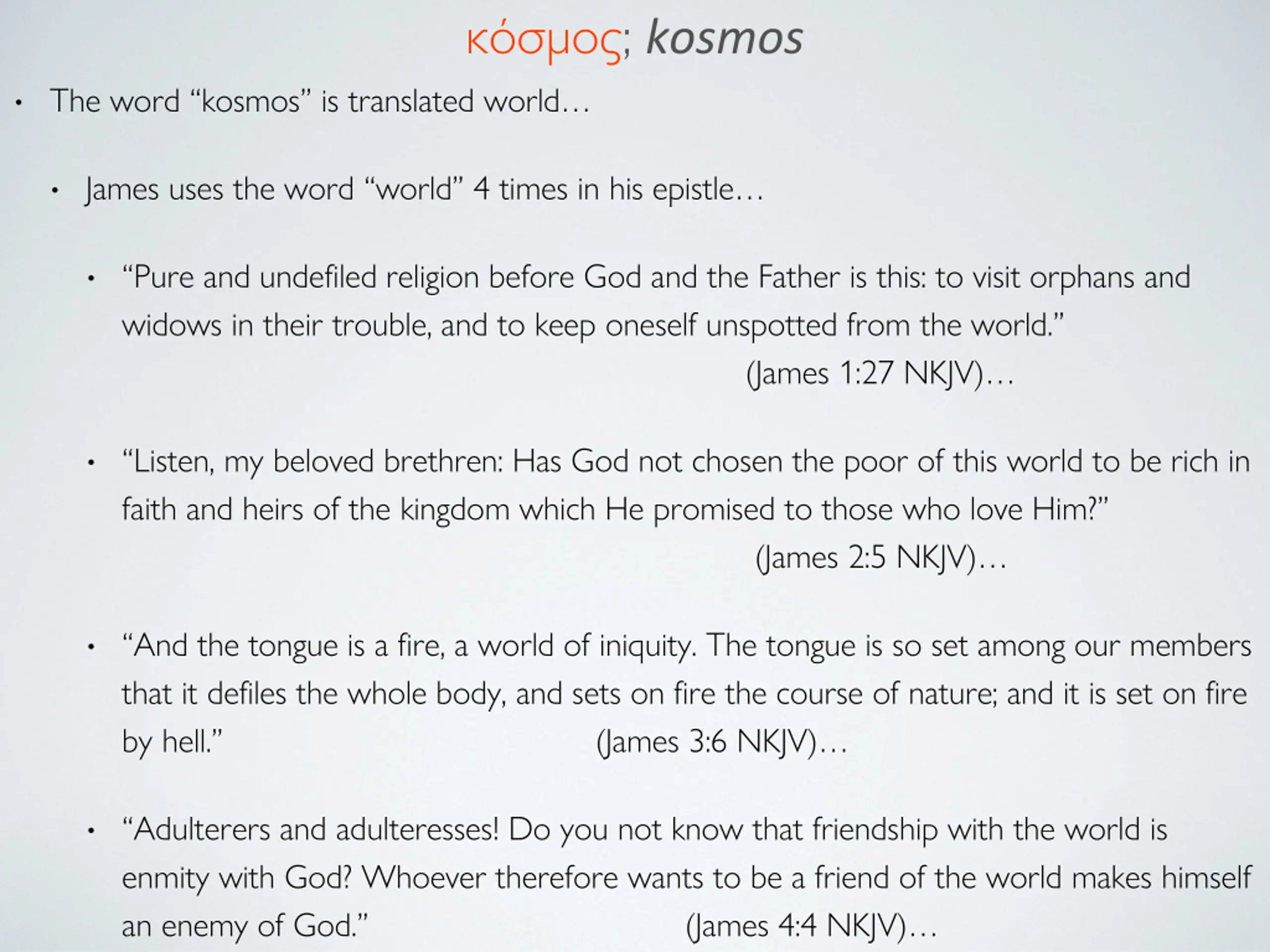 ; kosmos The word kosmos is translated world James uses the word world 4 times in his epistle Pure and undefiled religion before God and the Father is this: to visit orphans and widows in their trouble, and to keep oneself unspotted from the world. (James 1:27 NKJV) Listen, my beloved brethren: Has God not chosen the poor of this world to be rich in faith and heirs of the kingdom which He promised to those who love Him? (James 2:5 NKJV) And the tongue is a fire, a world of iniquity. The tongue is so set among our members that it defiles the whole body, and sets on fire the course of nature; and it is set on fire by hell. (James 3:6 NKJV) Adulterers and adulteresses! Do you not know that friendship with the world is enmity with God? Whoever therefore wants to be a friend of the world makes himself an enemy of God. (James 4:4 NKJV)
