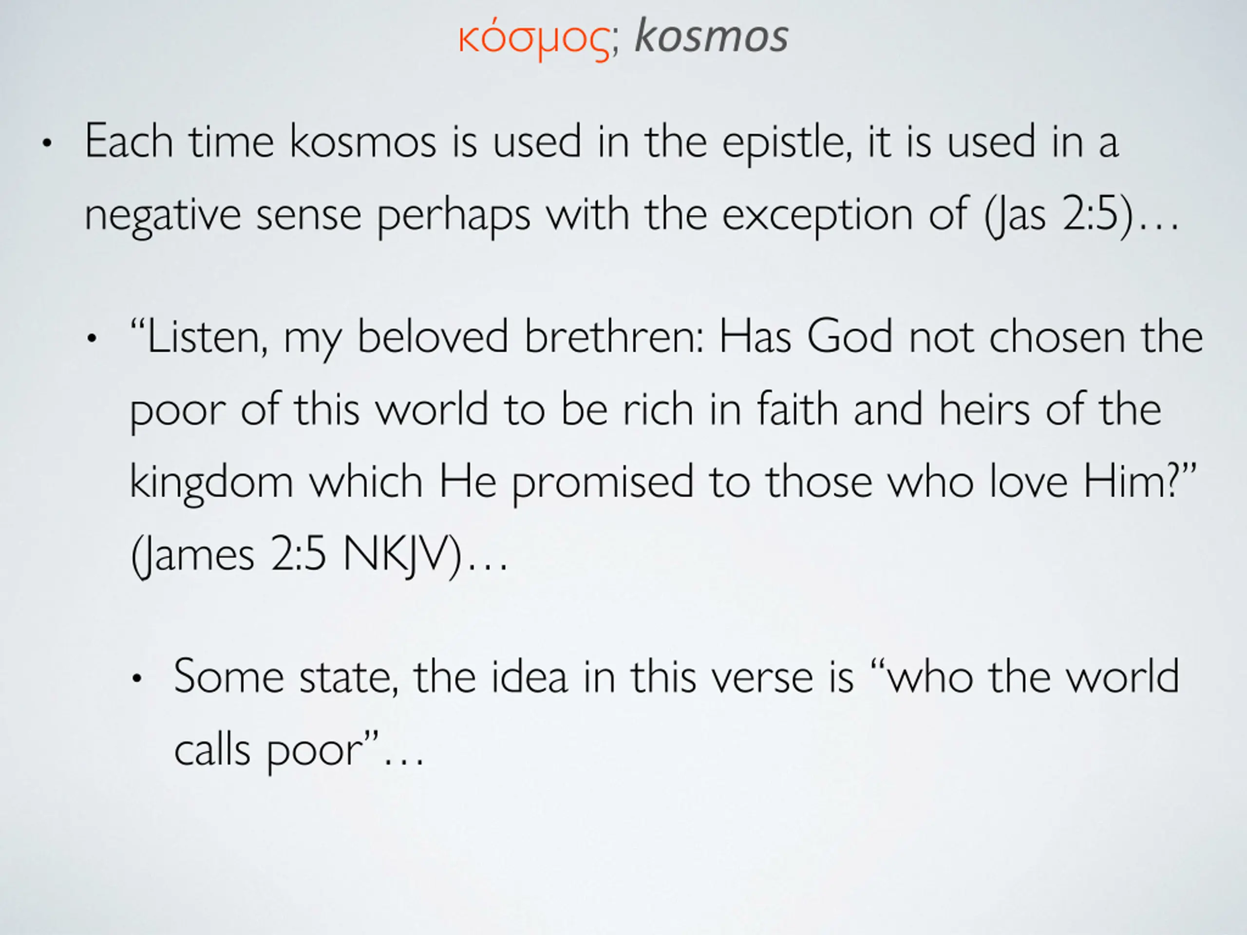 ; kosmos Each time kosmos is used in the epistle, it is used in a negative sense perhaps with the exception of (Jas 2:5) Listen, my beloved brethren: Has God not chosen the poor of this world to be rich in faith and heirs of the kingdom which He promised to those who love Him? (James 2:5 NKJV) Some state, the idea in this verse is who the world calls poor