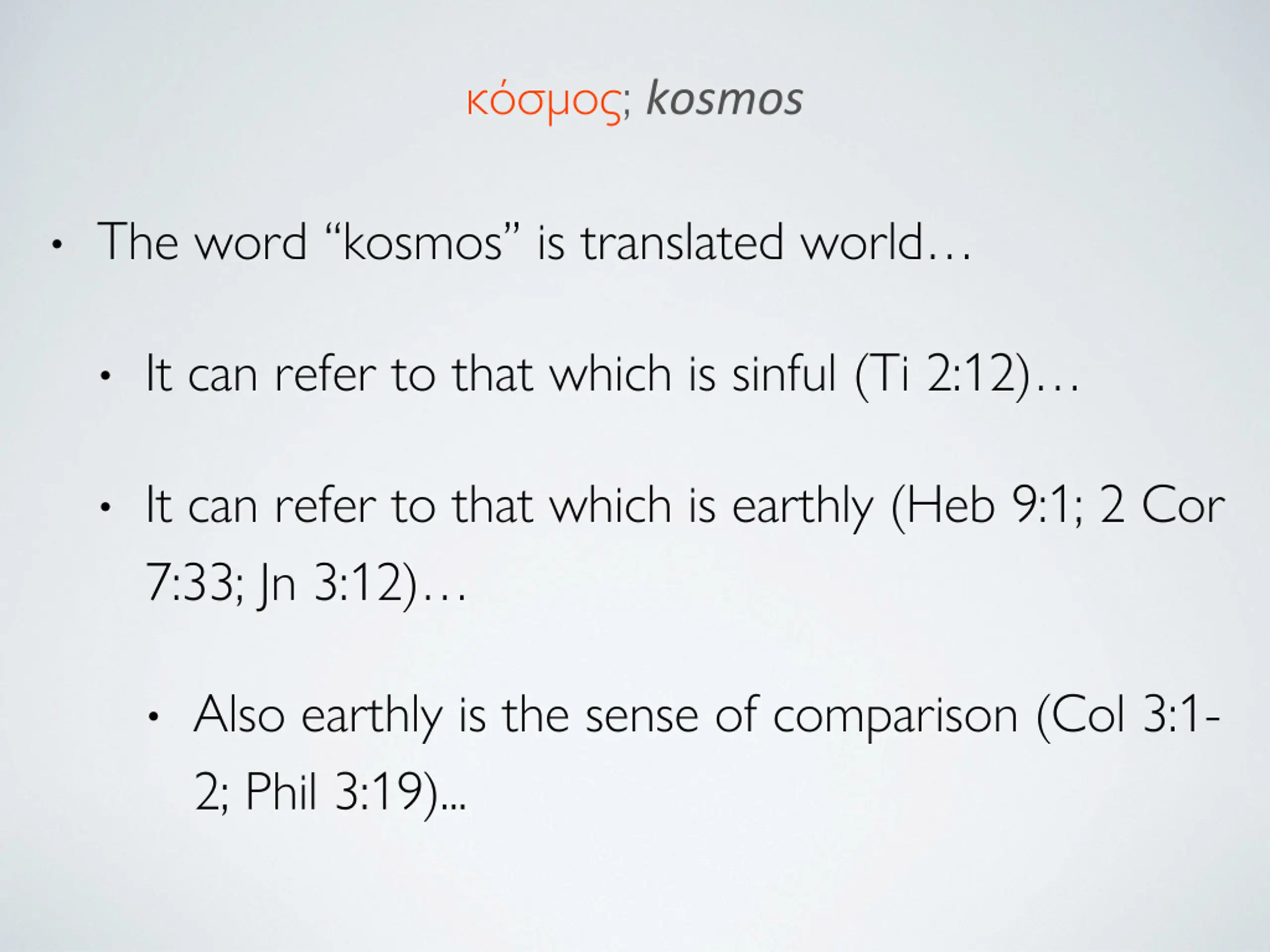 ; kosmos The word kosmos is translated world It can refer to that which is sinful (Ti 2:12) It can refer to that which is earthly (Heb 9:1; 2 Cor 7:33; Jn 3:12) Also earthly is the sense of comparison (Col 3:1- 2; Phil 3:19)...