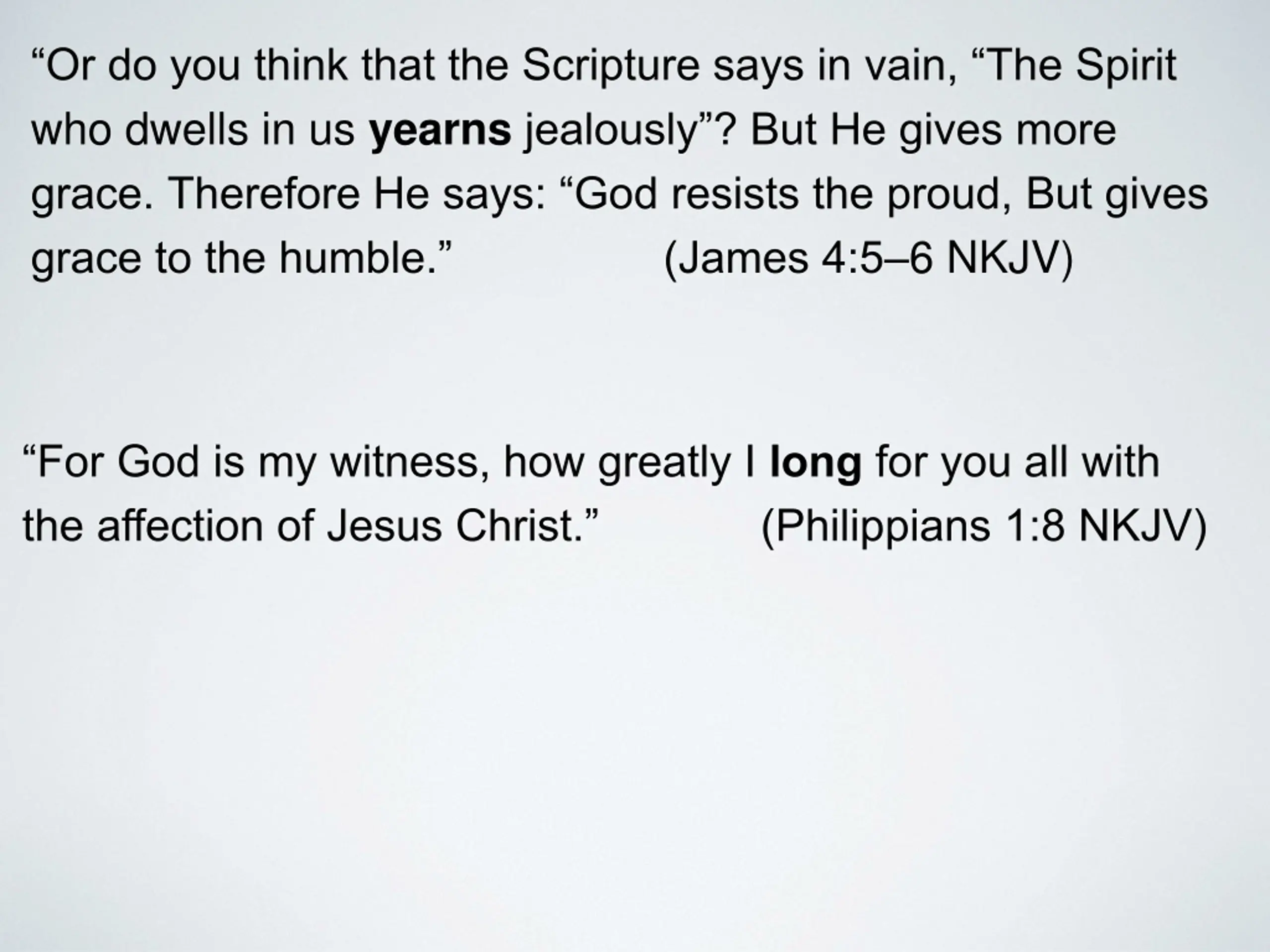 Or do you think that the Scripture says in vain, The Spirit who dwells in us yearnsjealously ? But He gives more grace. Therefore He says: God resists the proud, But gives grace to the humble. (James 4:5 6 NKJV) For God is my witness, how greatly I long for you all with the affection of Jesus Christ. (Philippians 1:8 NKJV)