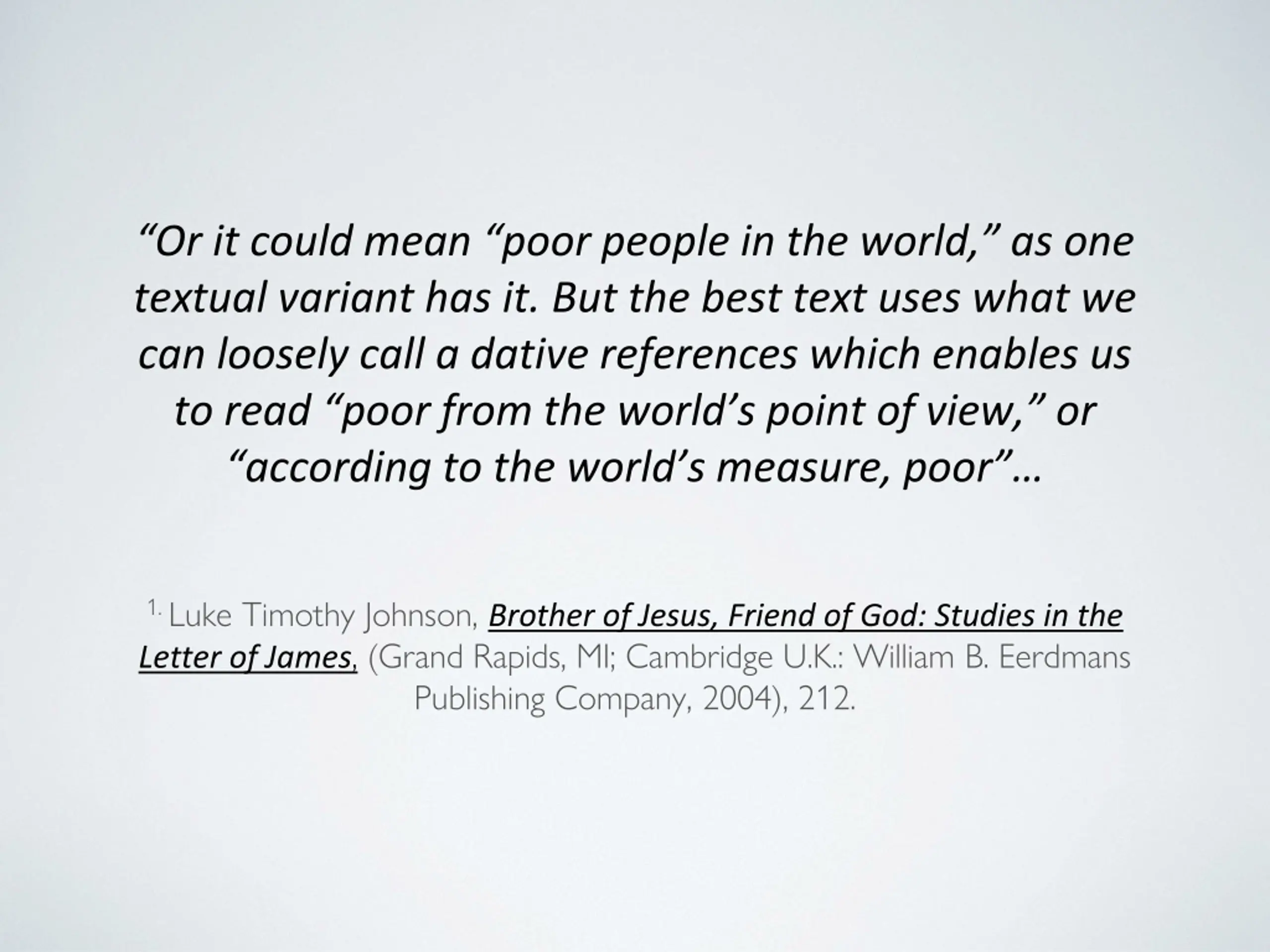 Or it could mean poor people in the world, as one textual variant has it. But the best text uses what we can loosely call a dative references which enables us to read poor from the world s point of view, or according to the world s measure, poor 1.Luke Timothy Johnson, Brother of Jesus, Friend of God: Studies in the Letter of James, (Grand Rapids, MI; Cambridge U.K.: William B. Eerdmans Publishing Company, 2004), 212.
