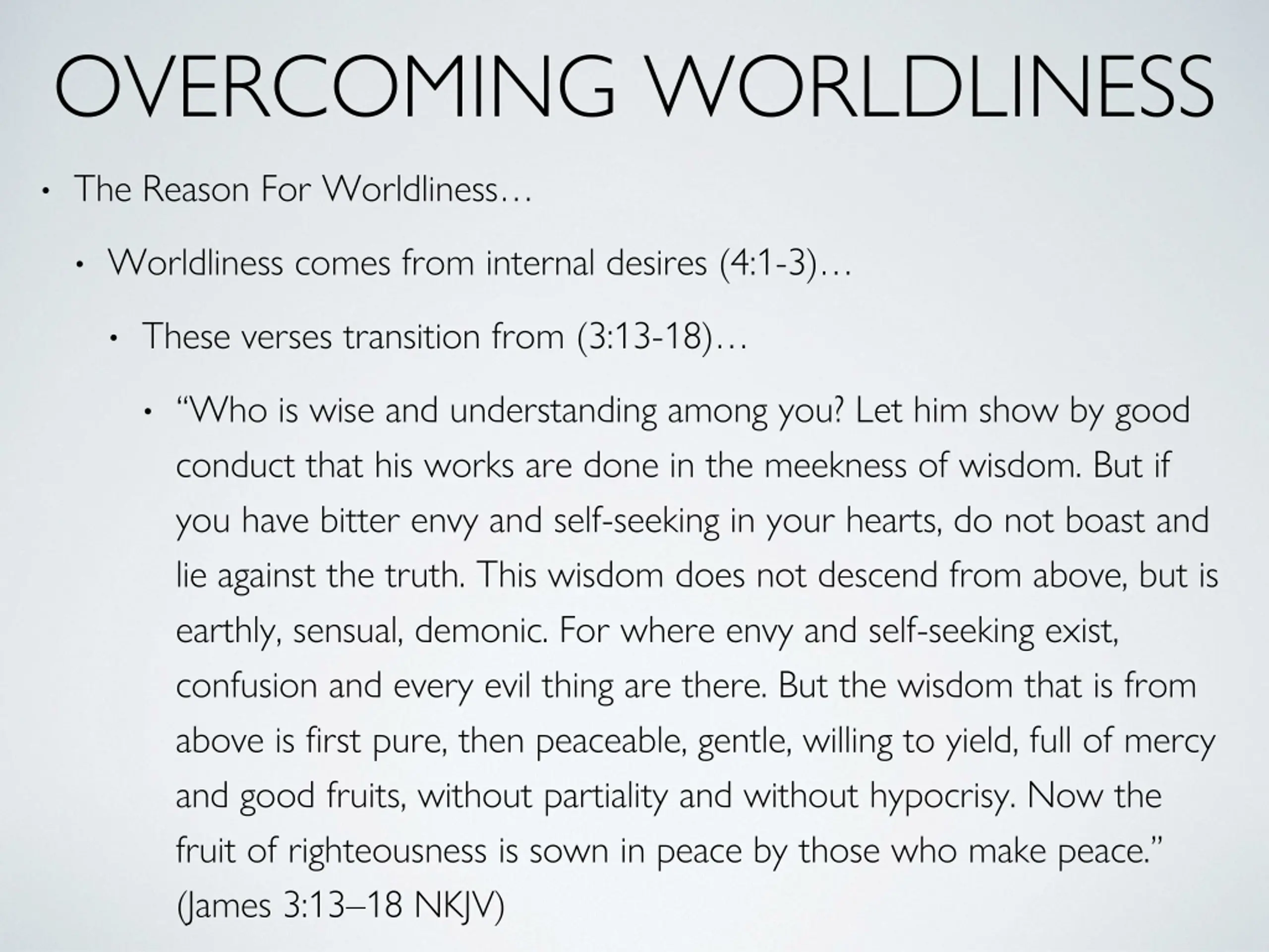 OVERCOMING WORLDLINESS The Reason For Worldliness Worldliness comes from internal desires (4:1-3) These verses transition from (3:13-18) Who is wise and understanding among you? Let him show by good conduct that his works are done in the meekness of wisdom. But if you have bitter envy and self-seeking in your hearts, do not boast and lie against the truth. This wisdom does not descend from above, but is earthly, sensual, demonic. For where envy and self-seeking exist, confusion and every evil thing are there. But the wisdom that is from above is first pure, then peaceable, gentle, willing to yield, full of mercy and good fruits, without partiality and without hypocrisy. Now the fruit of righteousness is sown in peace by those who make peace. (James 3:13 18 NKJV)