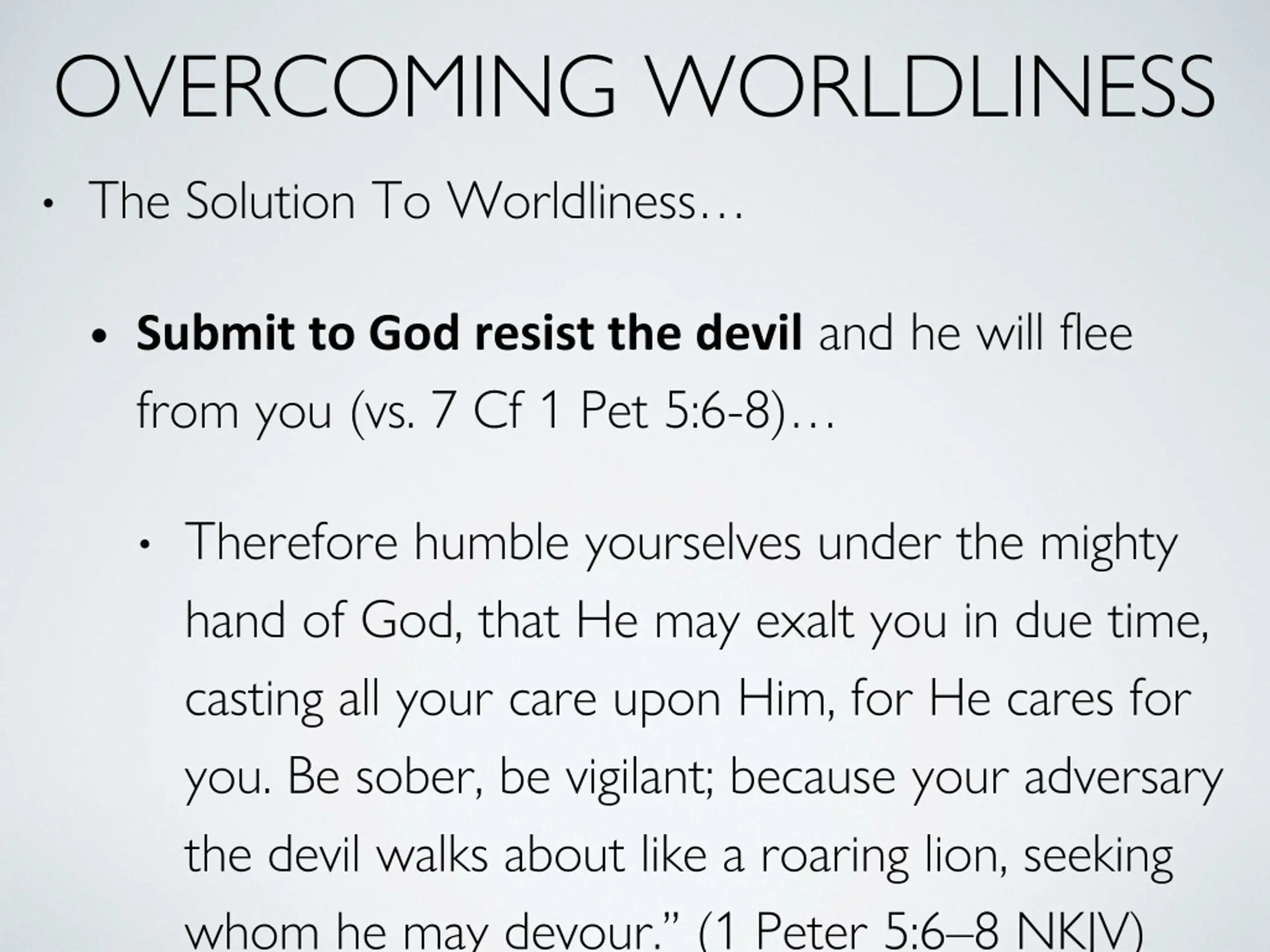 OVERCOMING WORLDLINESS The Solution To Worldliness Submit to God resist the devil and he will flee from you (vs. 7 Cf 1 Pet 5:6-8) Therefore humble yourselves under the mighty hand of God, that He may exalt you in due time, casting all your care upon Him, for He cares for you. Be sober, be vigilant; because your adversary the devil walks about like a roaring lion, seeking whom he may devour. (1 Peter 5:6 8 NKJV)