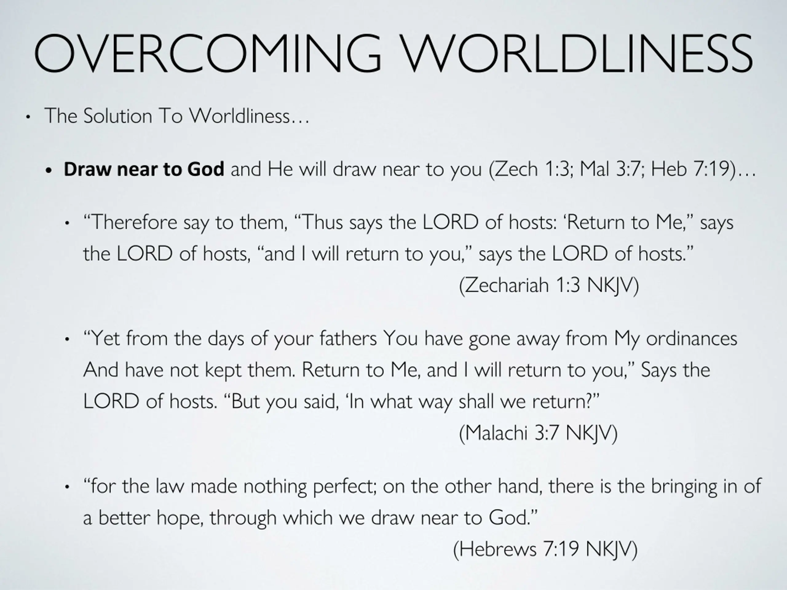 OVERCOMING WORLDLINESS The Solution To Worldliness Draw near to God and He will draw near to you (Zech 1:3; Mal 3:7; Heb 7:19) Therefore say to them, Thus says the LORD of hosts: Return to Me, says the LORD of hosts, and I will return to you, says the LORD of hosts. (Zechariah 1:3 NKJV) Yet from the days of your fathers You have gone away from My ordinances And have not kept them. Return to Me, and I will return to you, Says the LORD of hosts. But you said, In what way shall we return? (Malachi 3:7 NKJV) for the law made nothing perfect; on the other hand, there is the bringing in of a better hope, through which we draw near to God. (Hebrews 7:19 NKJV)