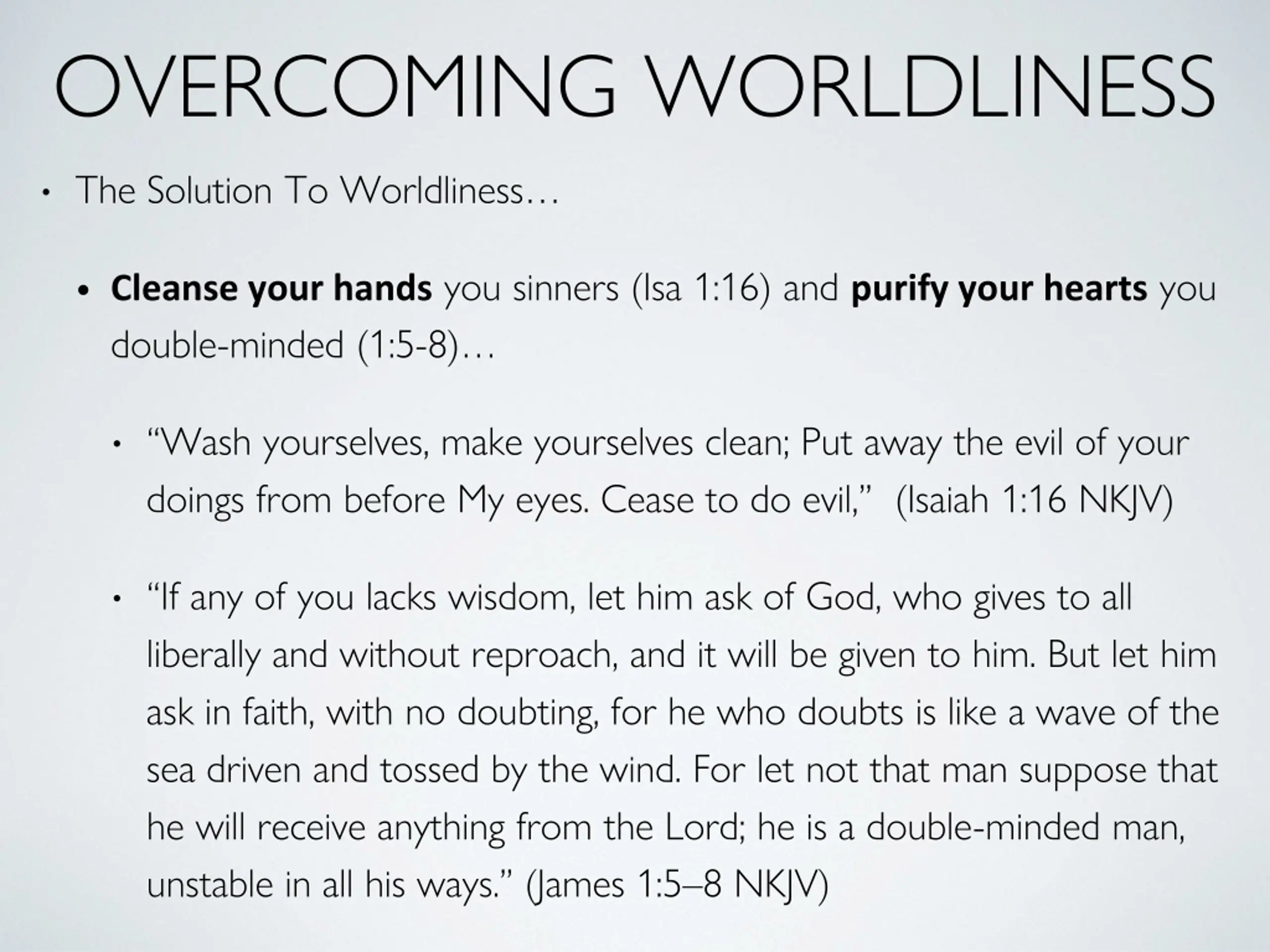 OVERCOMING WORLDLINESS The Solution To Worldliness Cleanse your hands you sinners (Isa 1:16) and purify your hearts you double-minded (1:5-8) Wash yourselves, make yourselves clean; Put away the evil of your doings from before My eyes. Cease to do evil, (Isaiah 1:16 NKJV) If any of you lacks wisdom, let him ask of God, who gives to all liberally and without reproach, and it will be given to him. But let him ask in faith, with no doubting, for he who doubts is like a wave of the sea driven and tossed by the wind. For let not that man suppose that he will receive anything from the Lord; he is a double-minded man, unstable in all his ways. (James 1:5 8 NKJV)