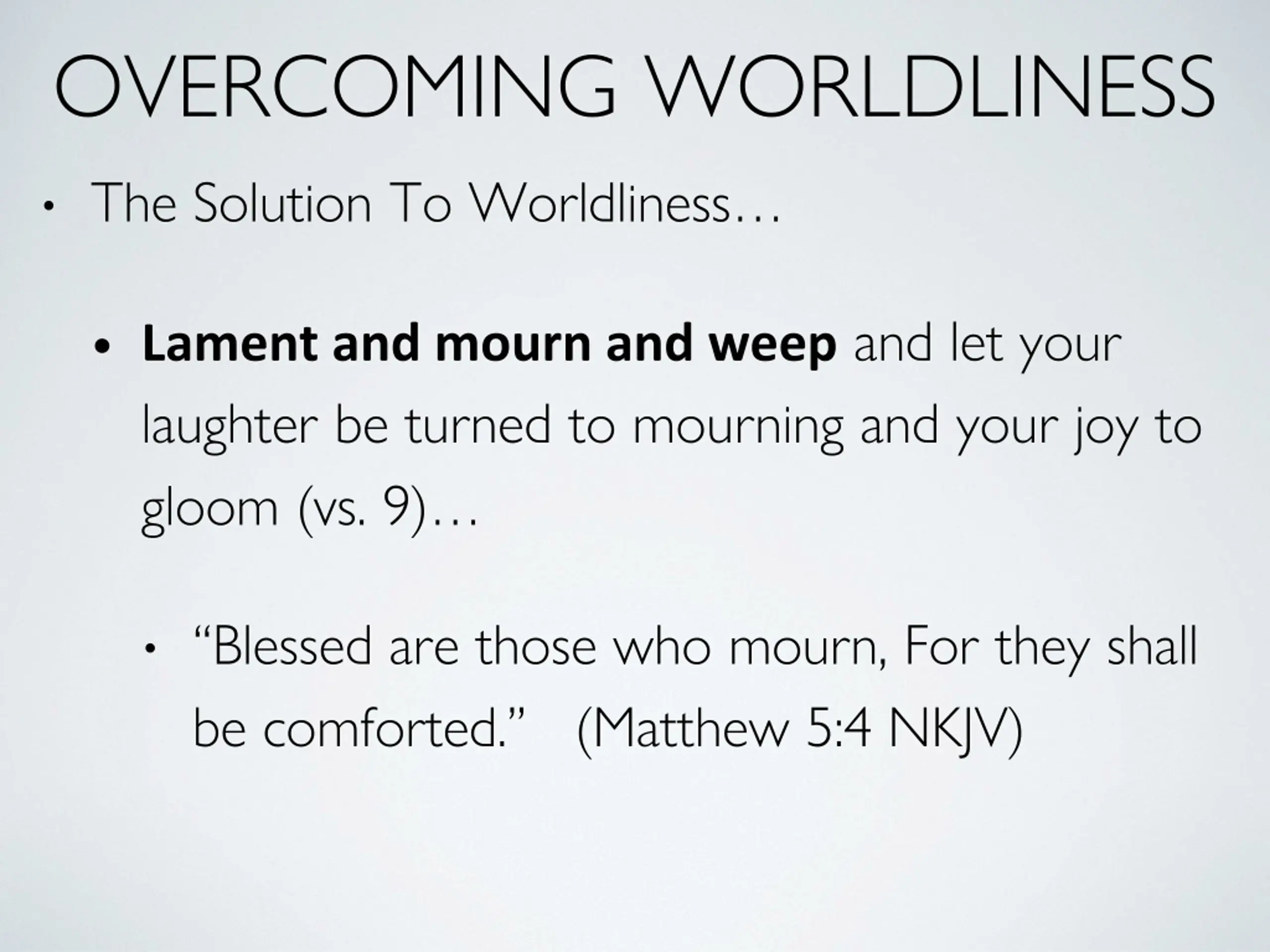 OVERCOMING WORLDLINESS The Solution To Worldliness Lament and mourn and weep and let your laughter be turned to mourning and your joy to gloom (vs. 9) Blessed are those who mourn, For they shall be comforted. (Matthew 5:4 NKJV)