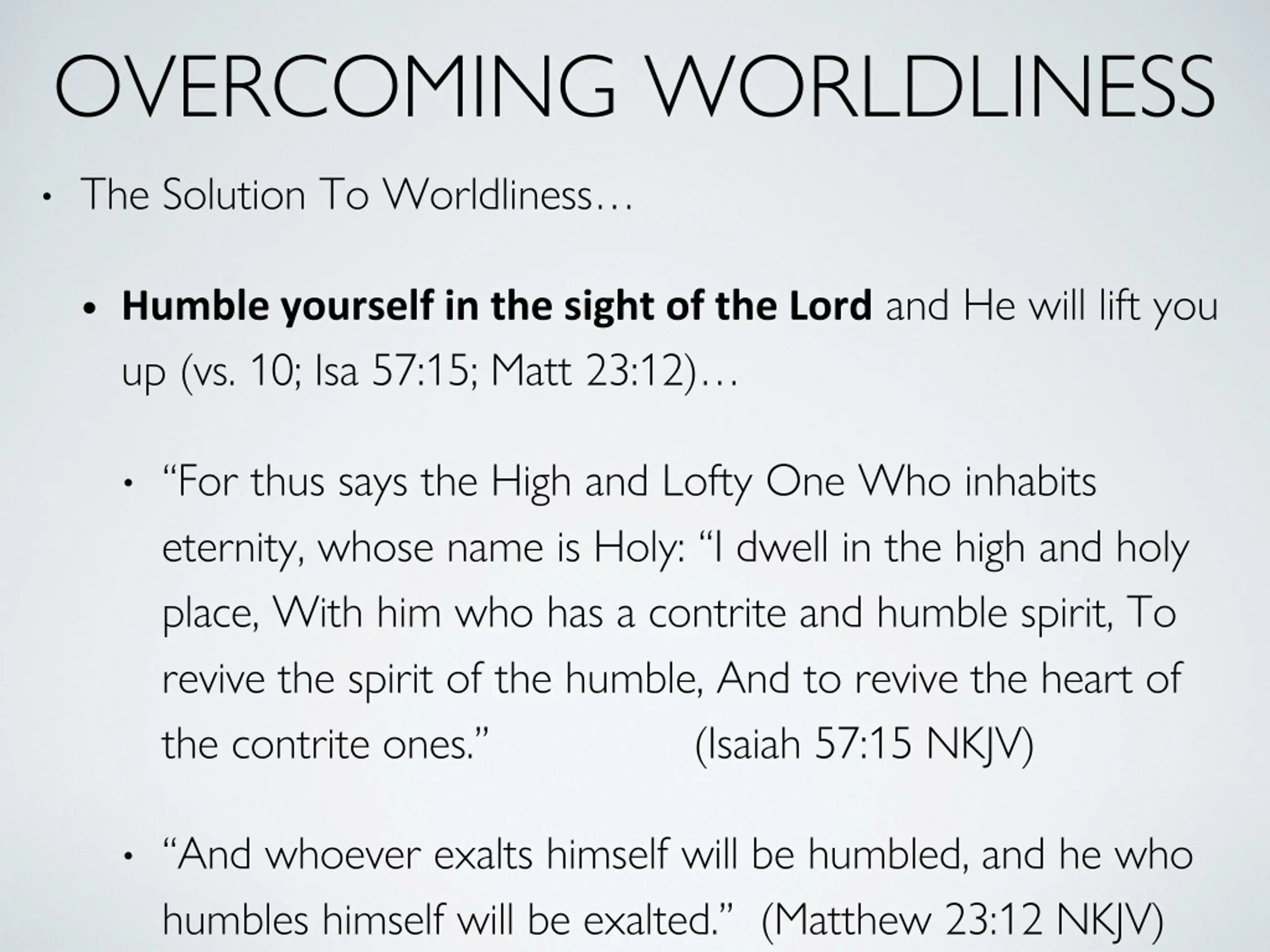 OVERCOMING WORLDLINESS The Solution To Worldliness Humble yourself in the sight of the Lord and He will lift you up (vs. 10; Isa 57:15; Matt 23:12) For thus says the High and Lofty One Who inhabits eternity, whose name is Holy: I dwell in the high and holy place, With him who has a contrite and humble spirit, To revive the spirit of the humble, And to revive the heart of the contrite ones. (Isaiah 57:15 NKJV) And whoever exalts himself will be humbled, and he who humbles himself will be exalted. (Matthew 23:12 NKJV)