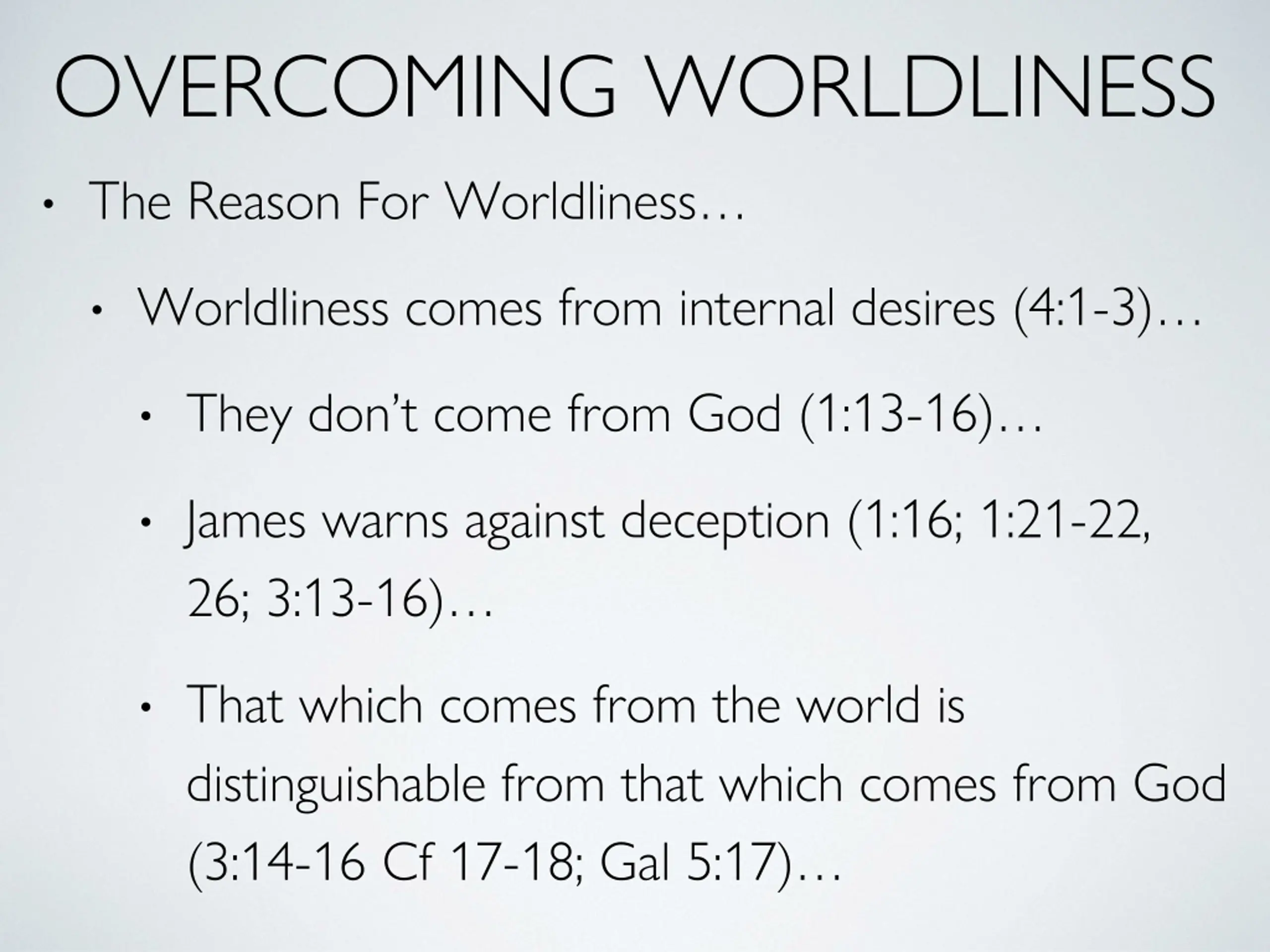 OVERCOMING WORLDLINESS The Reason For Worldliness Worldliness comes from internal desires (4:1-3) They don t come from God (1:13-16) James warns against deception (1:16; 1:21-22, 26; 3:13-16) That which comes from the world is distinguishable from that which comes from God (3:14-16 Cf 17-18; Gal 5:17)