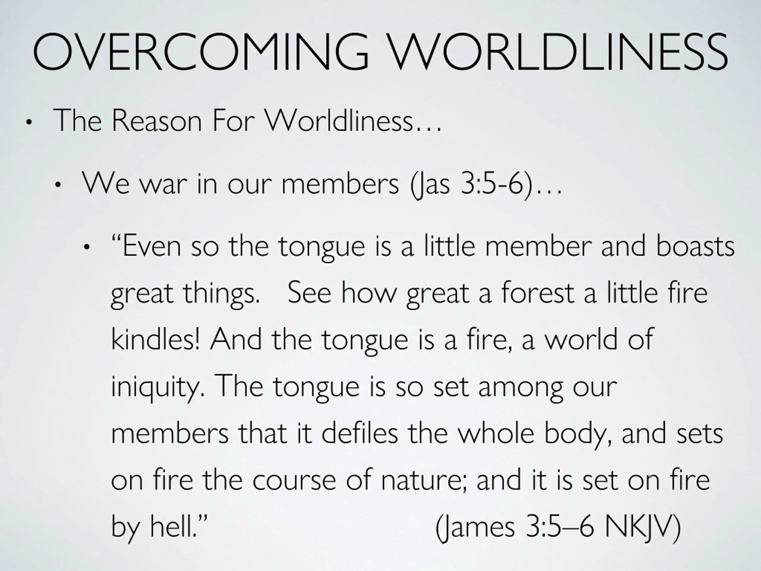 OVERCOMING WORLDLINESS The Reason For Worldliness We war in our members (Jas 3:5-6) Even so the tongue is a little member and boasts great things. See how great a forest a little fire kindles! And the tongue is a fire, a world of iniquity. The tongue is so set among our members that it defiles the whole body, and sets on fire the course of nature; and it is set on fire by hell. (James 3:5 6 NKJV)