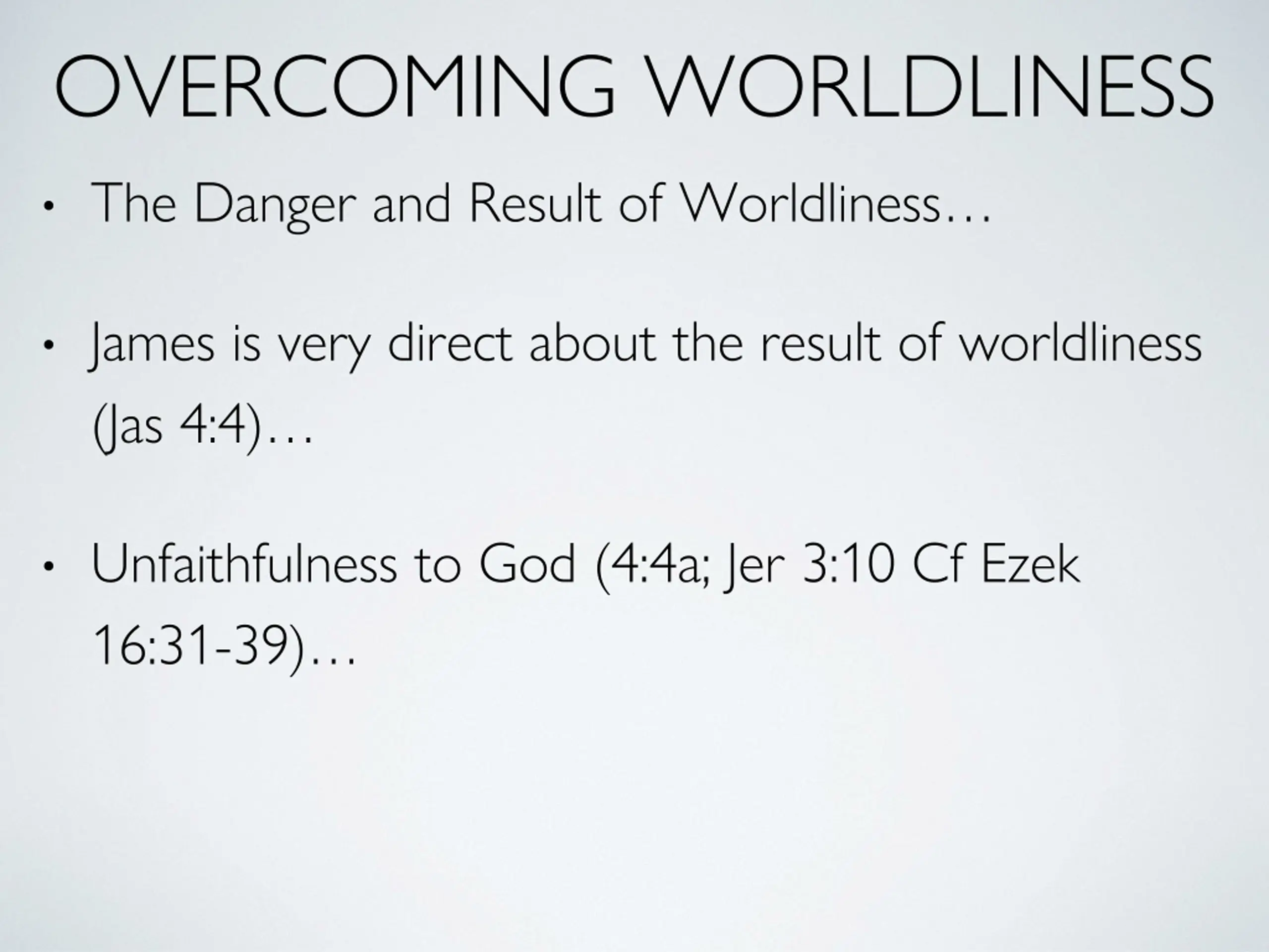 OVERCOMING WORLDLINESS The Danger and Result of Worldliness James is very direct about the result of worldliness (Jas 4:4) Unfaithfulness to God (4:4a; Jer 3:10 Cf Ezek 16:31-39)