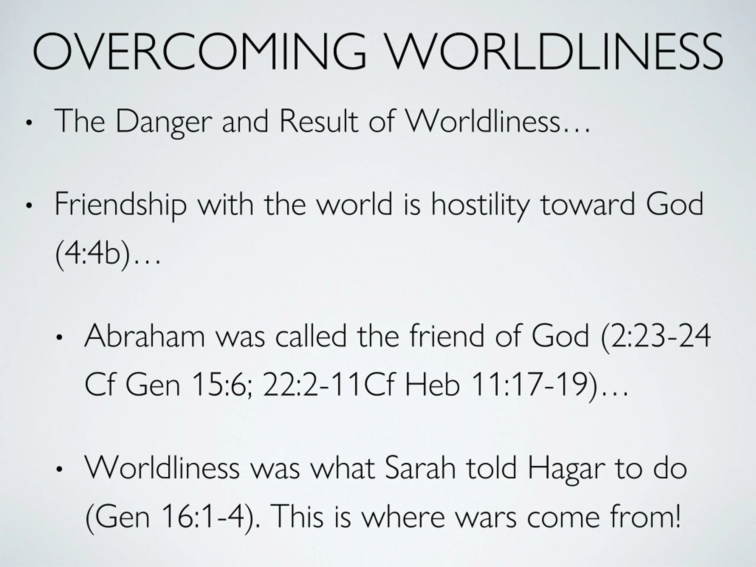 OVERCOMING WORLDLINESS The Danger and Result of Worldliness Friendship with the world is hostility toward God (4:4b) Abraham was called the friend of God (2:23-24 Cf Gen 15:6; 22:2-11Cf Heb 11:17-19) Worldliness was what Sarah told Hagar to do (Gen 16:1-4). This is where wars come from!