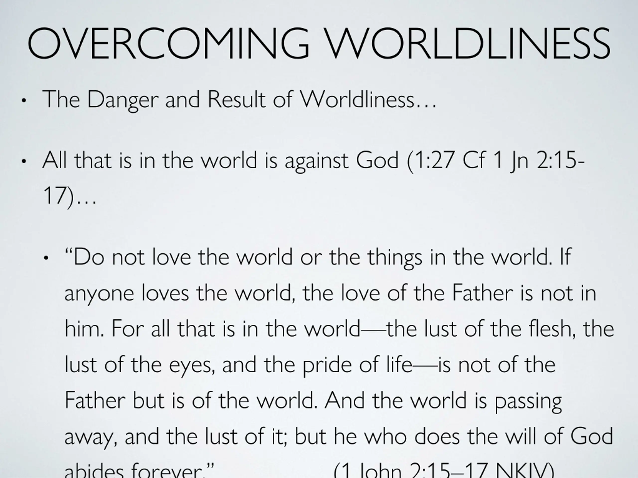 OVERCOMING WORLDLINESS The Danger and Result of Worldliness All that is in the world is against God (1:27 Cf 1 Jn 2:15- 17) Do not love the world or the things in the world. If anyone loves the world, the love of the Father is not in him. For all that is in the world the lust of the flesh, the lust of the eyes, and the pride of life is not of the Father but is of the world. And the world is passing away, and the lust of it; but he who does the will of God abides forever. (1 John 2:15 17 NKJV)