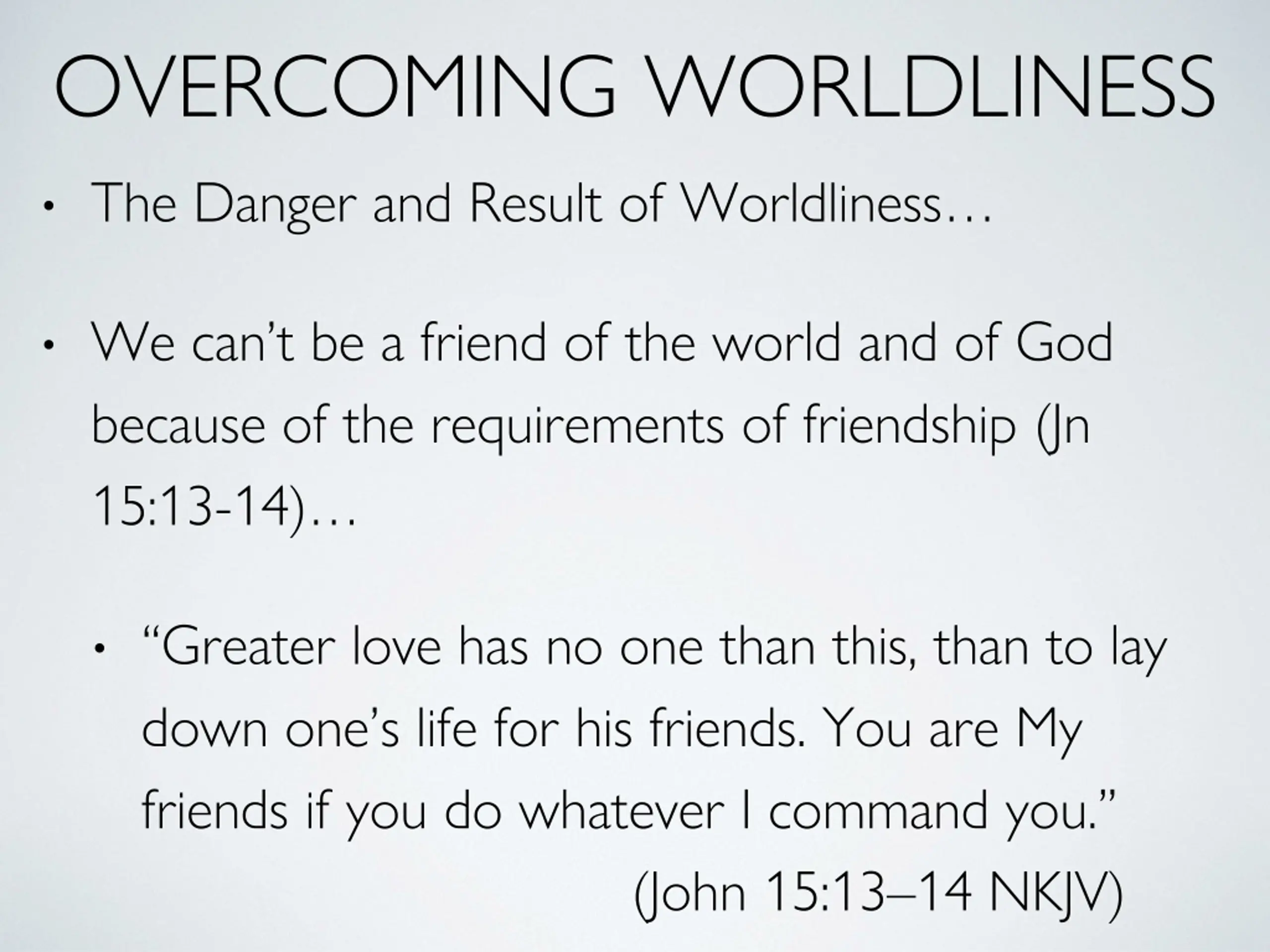 OVERCOMING WORLDLINESS The Danger and Result of Worldliness We can t be a friend of the world and of God because of the requirements of friendship (Jn 15:13-14) Greater love has no one than this, than to lay down one s life for his friends. You are My friends if you do whatever I command you. (John 15:13 14 NKJV)