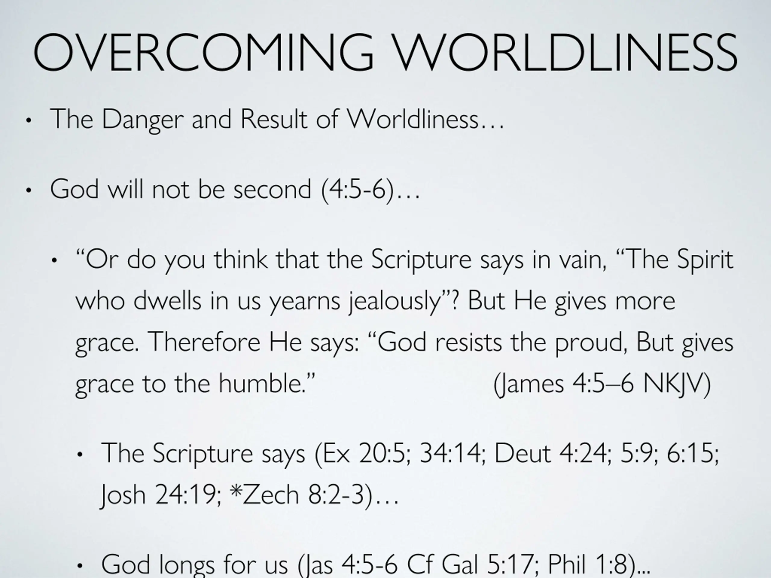 OVERCOMING WORLDLINESS The Danger and Result of Worldliness God will not be second (4:5-6) Or do you think that the Scripture says in vain, The Spirit who dwells in us yearns jealously ? But He gives more grace. Therefore He says: God resists the proud, But gives grace to the humble. (James 4:5 6 NKJV) The Scripture says (Ex 20:5; 34:14; Deut 4:24; 5:9; 6:15; Josh 24:19; *Zech 8:2-3) God longs for us (Jas 4:5-6 Cf Gal 5:17; Phil 1:8)...