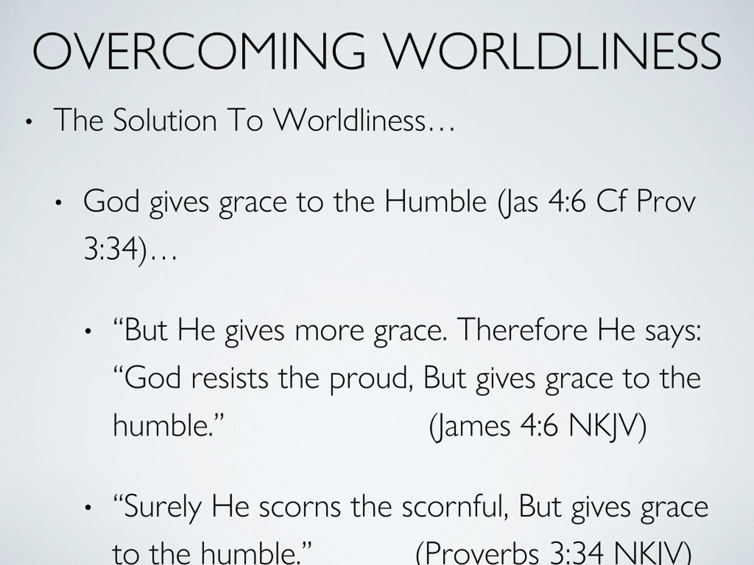 OVERCOMING WORLDLINESS The Solution To Worldliness God gives grace to the Humble (Jas 4:6 Cf Prov 3:34) But He gives more grace. Therefore He says: God resists the proud, But gives grace to the humble. (James 4:6 NKJV) Surely He scorns the scornful, But gives grace to the humble. (Proverbs 3:34 NKJV)