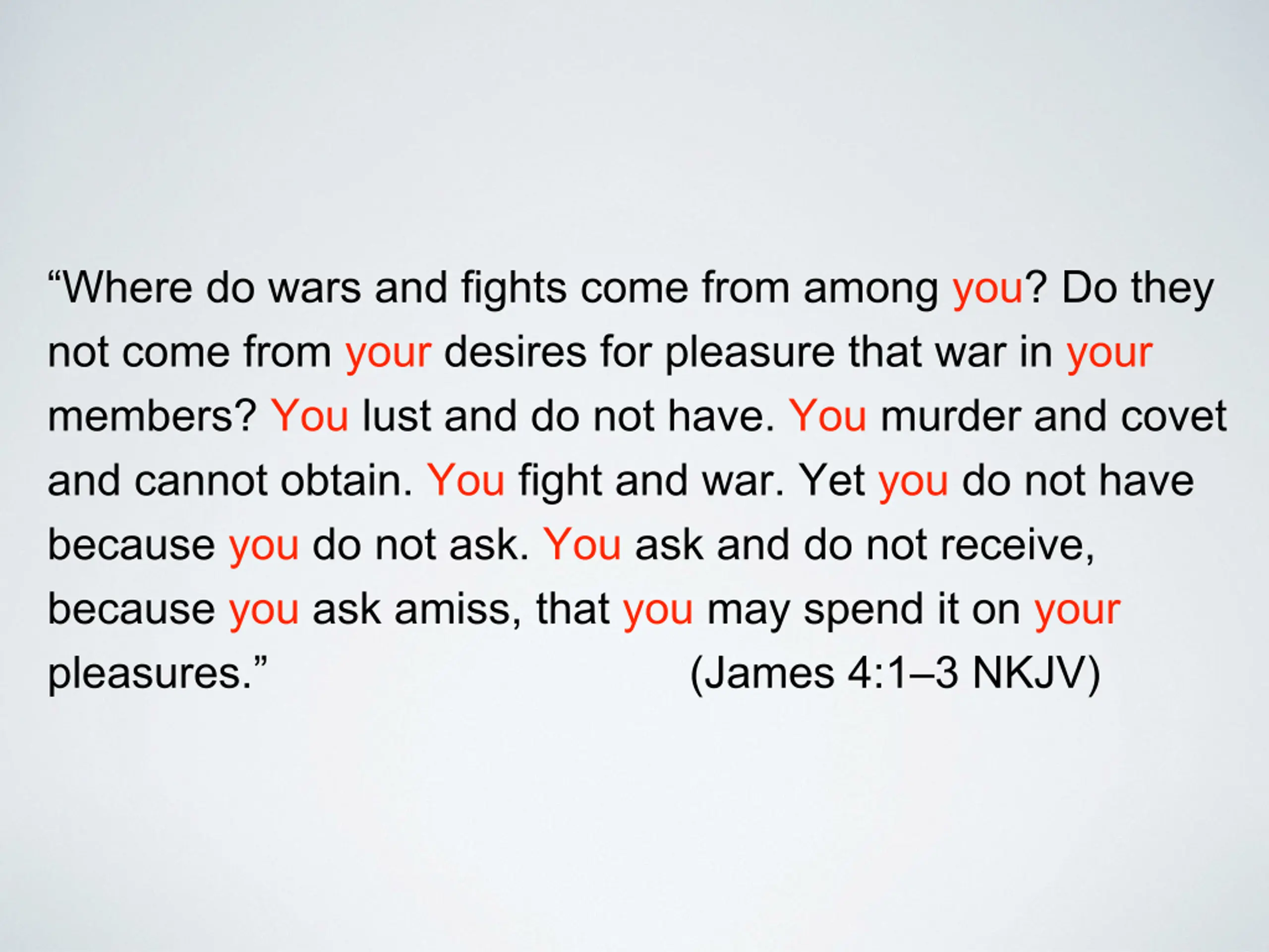 Where do wars and fights come from among you? Do they not come from your desires for pleasure that war in your members? You lust and do not have. You murder and covet and cannot obtain. You fight and war. Yet you do not have because you do not ask. You ask and do not receive, because you ask amiss, that you may spend it on your pleasures. (James 4:1 3 NKJV)