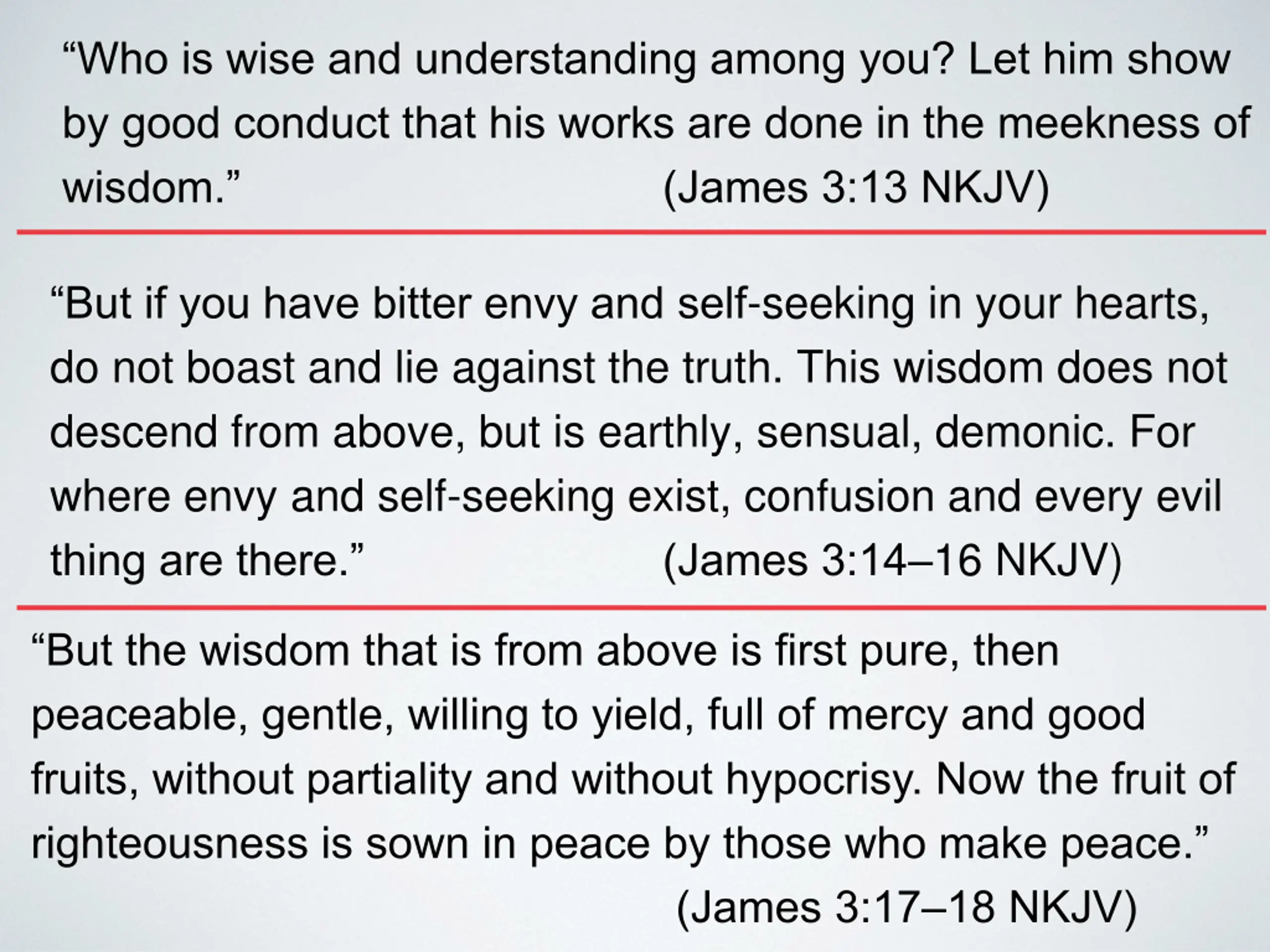 Who is wise and understanding among you? Let him show by good conduct that his works are done in the meekness of wisdom. (James 3:13 NKJV) But if you have bitter envy and self-seeking in your hearts, do not boast and lie against the truth. This wisdom does not descend from above, but is earthly, sensual, demonic. For where envy and self-seeking exist, confusion and every evil thing are there. (James 3:14 16 NKJV) But the wisdom that is from above is first pure, then peaceable, gentle, willing to yield, full of mercy and good fruits, without partiality and without hypocrisy. Now the fruit of righteousness is sown in peace by those who make peace. (James 3:17 18 NKJV)