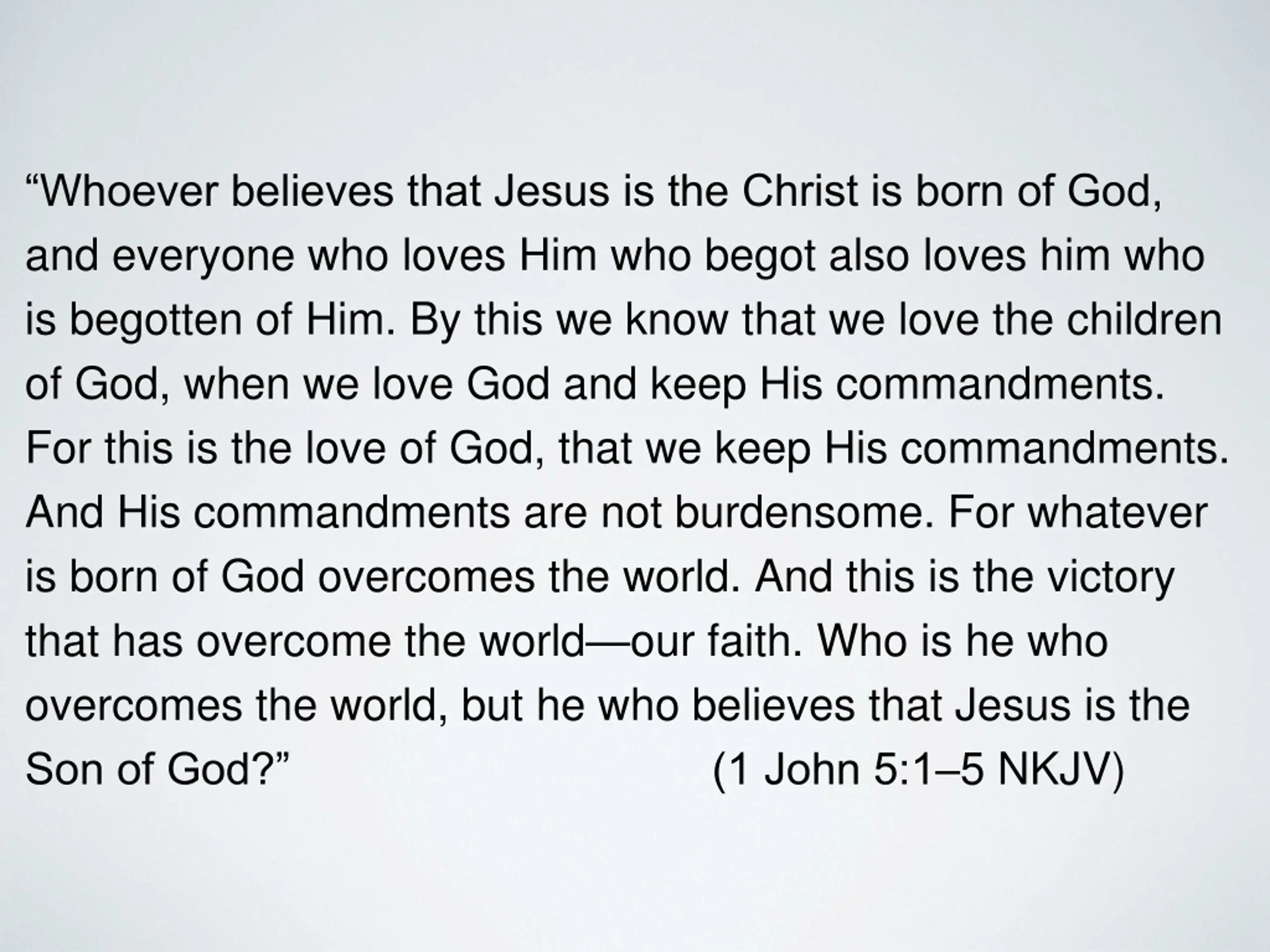 Whoever believes that Jesus is the Christ is born of God, and everyone who loves Him who begot also loves him who is begotten of Him. By this we know that we love the children of God, when we love God and keep His commandments. For this is the love of God, that we keep His commandments. And His commandments are not burdensome. For whatever is born of God overcomes the world. And this is the victory that has overcome the world our faith. Who is he who overcomes the world, but he who believes that Jesus is the Son of God? (1 John 5:1 5 NKJV)