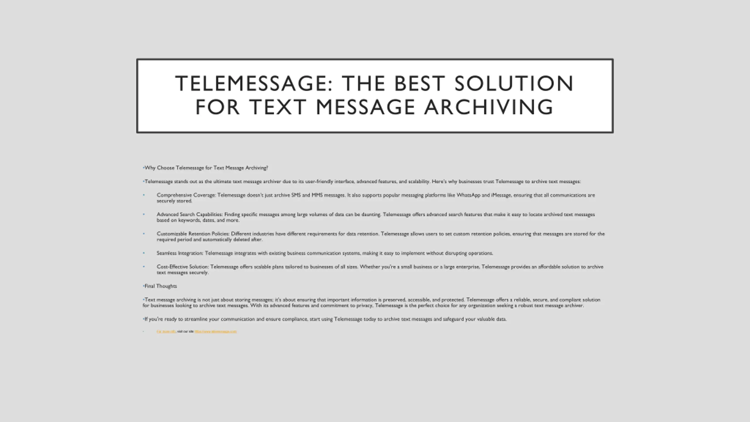 TELEMESSAGE: THE BEST SOLUTION FOR TEXT MESSAGE ARCHIVING In today's fast-paced world, businesses and individuals rely heavily on text messages for communication. Whether for customer service, internal team communication, or personal use, text messages often hold valuable information that needs to be stored for future reference. This is where Telemessage, a leading text message archiver, comes into play. With its robust features, Telemessage helps users efficiently archive text messages, ensuring they are always accessible when needed. What is a Text Message Archiver? A text message archiver is a tool designed to automatically save and organize text messages in a secure and searchable format. This can be particularly valuable for businesses that need to comply with regulatory requirements or maintain records for legal purposes. Text message archiving also allows for easy retrieval of important information and the ability to manage communications effectively. Telemessage provides a comprehensive archiving solution for all types of text messages, including SMS, MMS, and chats from platforms like WhatsApp and iMessage. By archiving text messages, users can protect valuable data, maintain compliance, and streamline communication processes within their organizations. Why Archive Text Messages? Archiving text messages is essential for several reasons: Compliance with Regulations: Many industries, including healthcare, finance, and legal sectors, require businesses to store communication records for a specified period. Telemessage s archiving solution ensures compliance with industry regulations such as HIPAA, FINRA, and GDPR. Legal Protection: In case of legal disputes, having archived text messages can serve as evidence. Telemessage securely stores all messages, making them easily retrievable if needed for litigation or other legal purposes. Data Retention: Archiving text messages ensures important conversations aren t lost. It allows businesses to keep a permanent record of customer interactions, team discussions, and other critical communication for long-term reference. Security and Privacy: Telemessage prioritizes security, ensuring that all archived messages are encrypted and stored in a secure, private cloud. This helps protect sensitive information and ensures that data is not exposed to unauthorized access.
