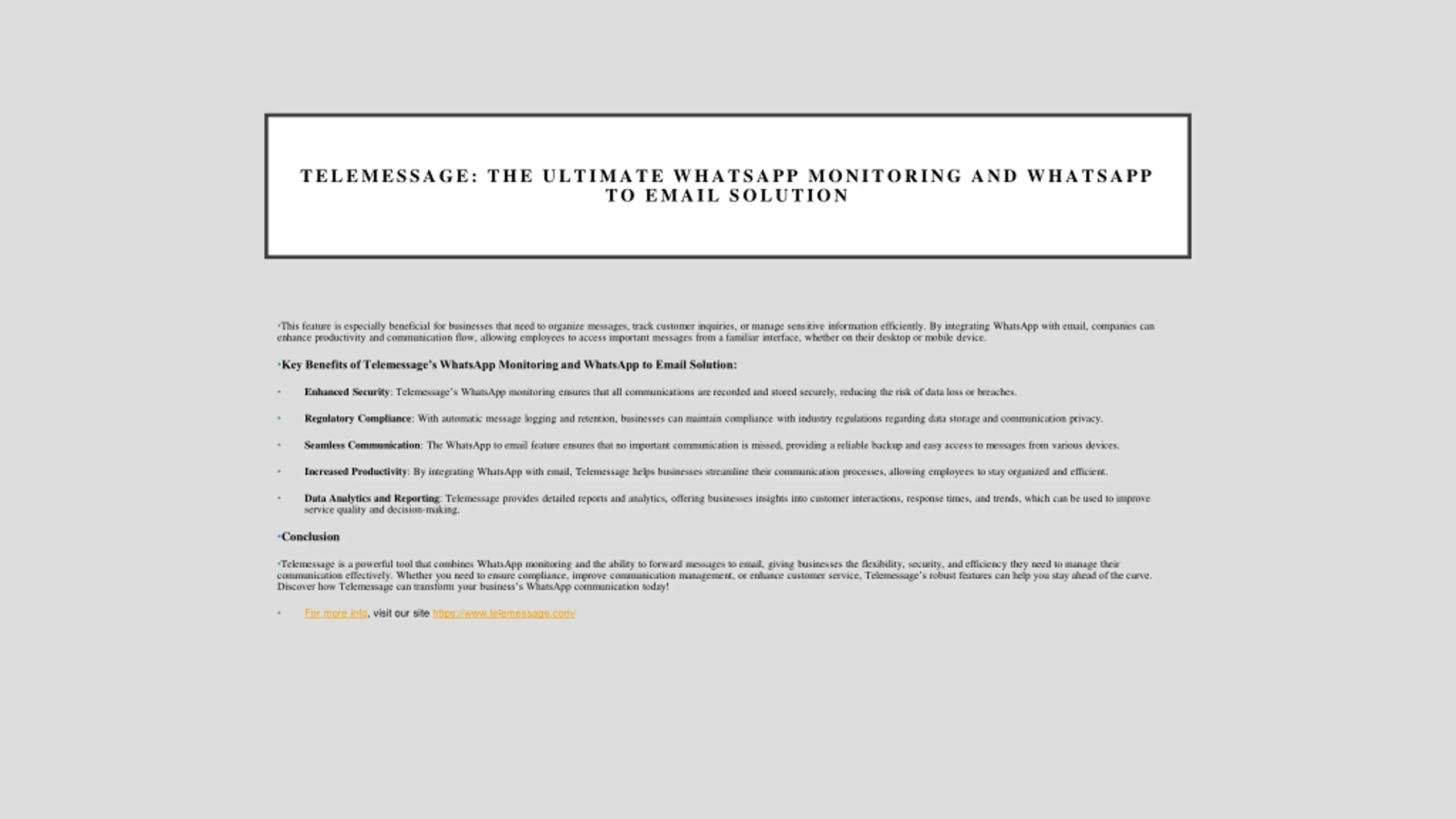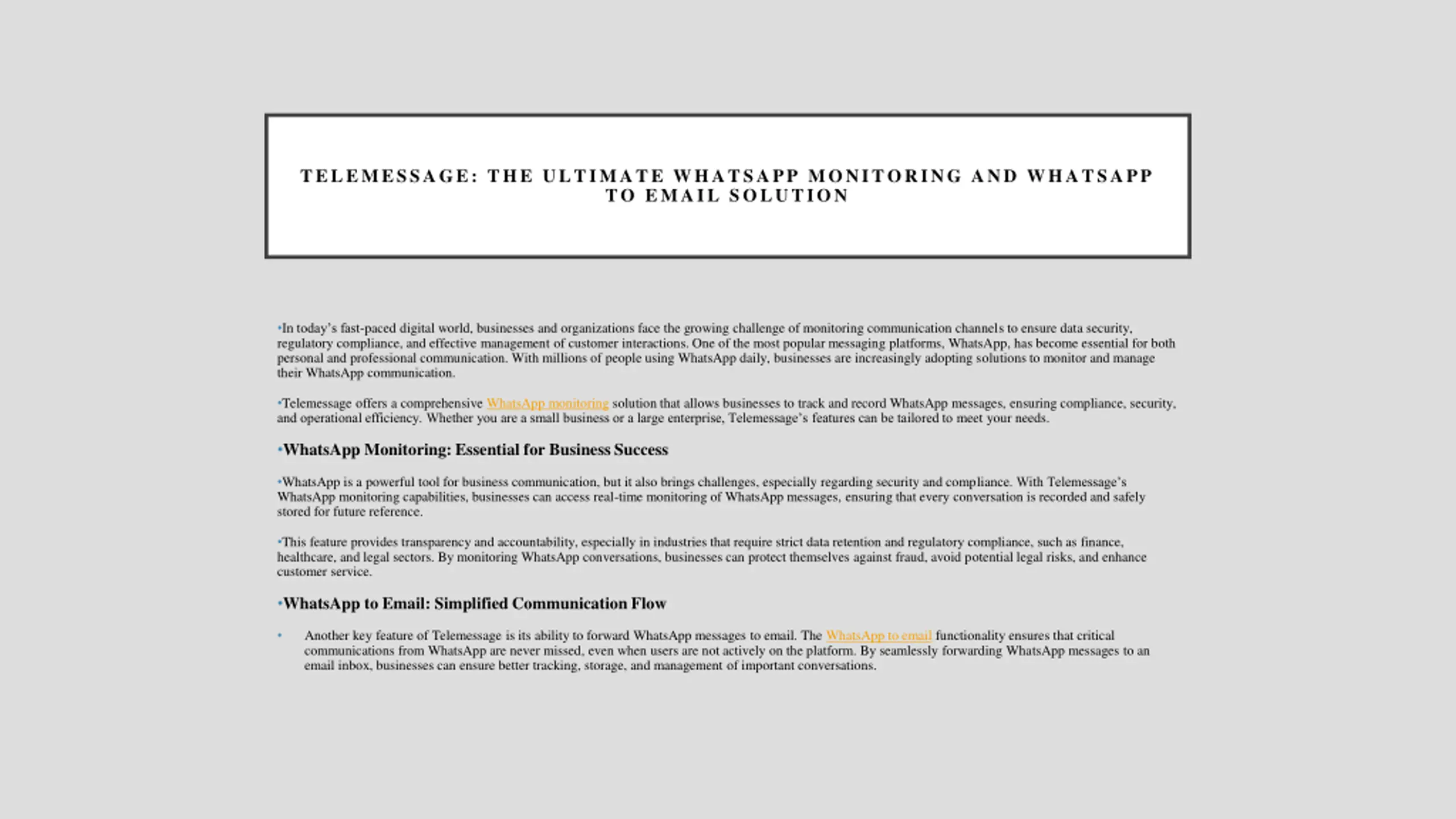 TELEMESSAGE: THE ULTIMATE WHATSAPP MONITORING AND WHATSAPP TO EMAIL SOLUTION In today s fast-paced digital world, businesses and organizations face the growing challenge of monitoring communication channels to ensure data security, regulatory compliance, and effective management of customer interactions. One of the most popular messaging platforms, WhatsApp, has become essential for both personal and professional communication. With millions of people using WhatsApp daily, businesses are increasingly adopting solutions to monitor and manage their WhatsApp communication. Telemessage offers a comprehensive WhatsApp monitoring solution that allows businesses to track and record WhatsApp messages, ensuring compliance, security, and operational efficiency. Whether you are a small business or a large enterprise, Telemessage s features can be tailored to meet your needs. WhatsApp Monitoring: Essential for Business Success WhatsApp is a powerful tool for business communication, but it also brings challenges, especially regarding security and compliance. With Telemessage s WhatsApp monitoring capabilities, businesses can access real-time monitoring of WhatsApp messages, ensuring that every conversation is recorded and safely stored for future reference. This feature provides transparency and accountability, especially in industries that require strict data retention and regulatory compliance, such as finance, healthcare, and legal sectors. By monitoring WhatsApp conversations, businesses can protect themselves against fraud, avoid potential legal risks, and enhance customer service. WhatsApp to Email: Simplified Communication Flow Another key feature of Telemessage is its ability to forward WhatsApp messages to email. The WhatsApp to email functionality ensures that critical communications from WhatsApp are never missed, even when users are not actively on the platform. By seamlessly forwarding WhatsApp messages to an email inbox, businesses can ensure better tracking, storage, and management of important conversations.