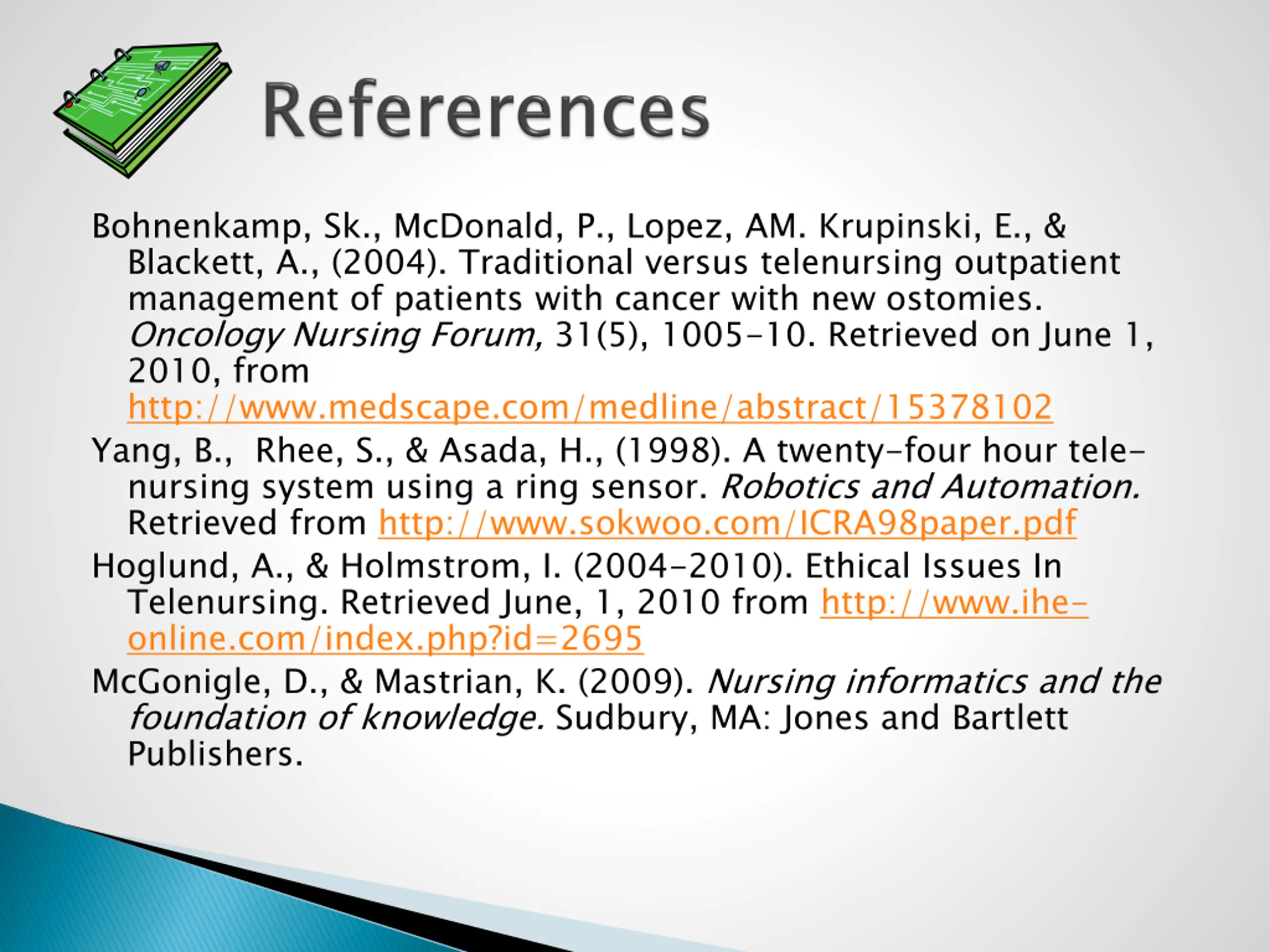 Bohnenkamp, Sk., McDonald, P., Lopez, AM. Krupinski, E., & Blackett, A., (2004). Traditional versus telenursing outpatient management of patients with cancer with new ostomies. Oncology Nursing Forum, 31(5), 1005-10. Retrieved on June 1, 2010, from http://www.medscape.com/medline/abstract/15378102 Yang, B., Rhee, S., & Asada, H., (1998). A twenty-four hour tele- nursing system using a ring sensor. Robotics and Automation. Retrieved from http://www.sokwoo.com/ICRA98paper.pdf Hoglund, A., & Holmstrom, I. (2004-2010). Ethical Issues In Telenursing. Retrieved June, 1, 2010 from http://www.ihe- online.com/index.php?id=2695 McGonigle, D., & Mastrian, K. (2009). Nursing informatics and the foundation of knowledge. Sudbury, MA: Jones and Bartlett Publishers.