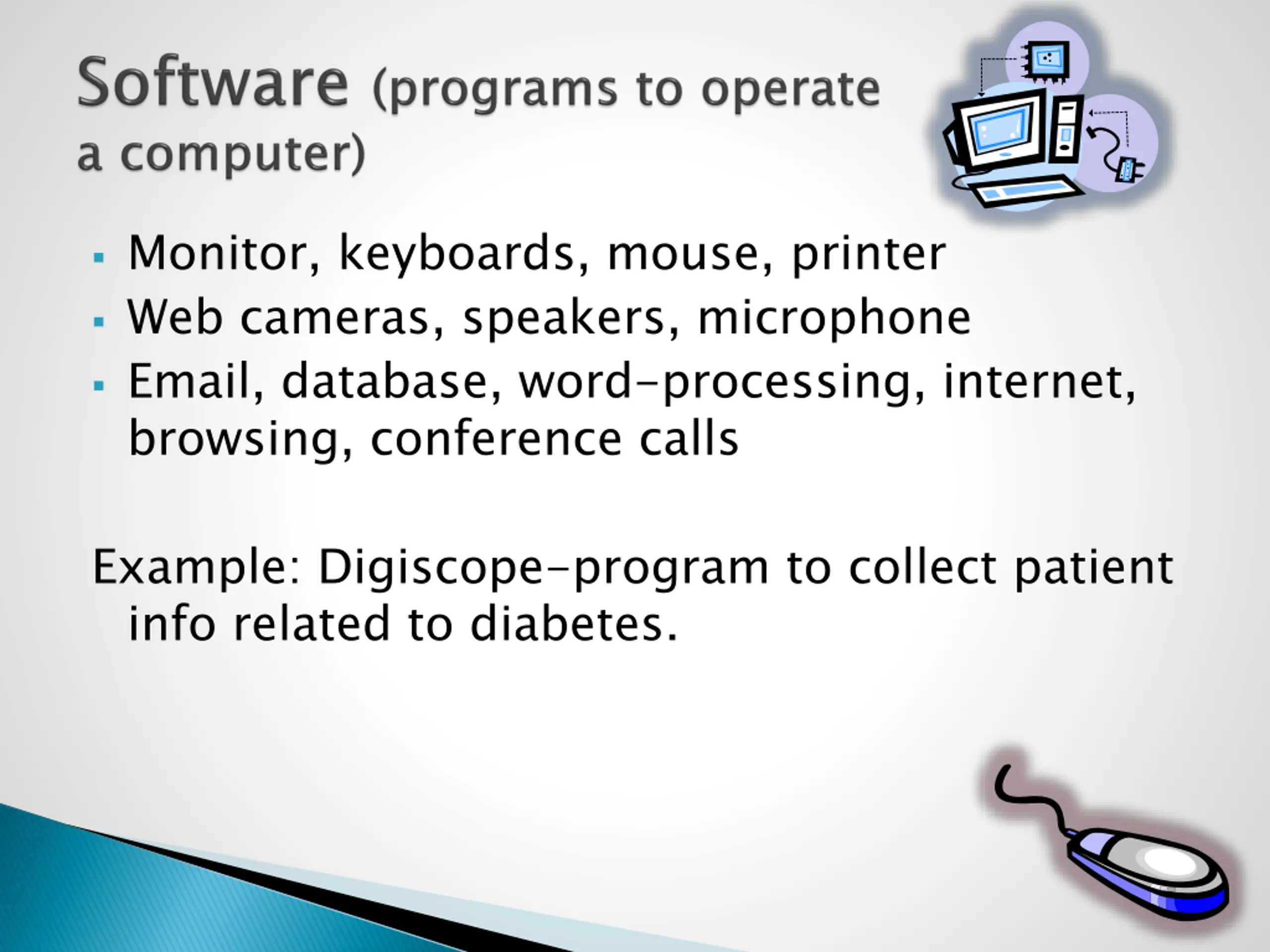 Monitor, keyboards, mouse, printer Web cameras, speakers, microphone Email, database, word-processing, internet, browsing, conference calls Example: Digiscope-program to collect patient info related to diabetes.