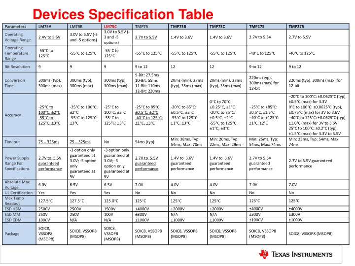 Devices Specification Table Parameters LM75A LM75B LM75C 3.0V to 5.5V (- 3 and -5 options) TMP75 TMP75B TMP75C TMP175 TMP275 Operating Voltage Range 3.0V to 5.5V (-3 and -5 options) 2.7V to 5.5V 2.7V to 5.5V 2.4V to 5.5V 2.7V to 5.5V 1.4V to 3.6V 1.4V to 3.6V Operating Temperature Range -55 C to 125 C -55 C to 125 C -55 C to 125 C -55 C to 125 C -55 C to 125 C -55 C to 125 C -40 C to 125 C -40 C to 125 C 9 to 12 9 to 12 Bit Resolution 9 9 9 9 to 12 12 12 9-Bit: 27.5ms 10-Bit: 55ms 11-Bit: 110ms 12-Bit: 220ms 220ms (typ), 300ms (max) for 12-bit Conversion Time 300ms (typ), 300ms (max) 300ms (typ), 300ms (max) 300ms (typ), 300ms (max) 20ms (min), 27ms (typ), 35ms (max) 20ms (min), 27ms (typ), 35ms (max) 220ms (typ), 300ms (max) for 12-bit 20 C to 100 C: 0.0625 C (typ), 0.5 C (max) for 3.3V 0 C to 100 C: 0.0625 C (typ), 0.75 C (max) for 3V to 3.6V 40 C to 125 C: 0.0625 C (typ), 1.0 C (max) for 3V to 3.6V 25 C to 100 C: 0.2 C (typ), 1.5 C (max) for 3.3V to 5.5V Min: 25ms, Typ: 54ms, Max: 74ms 0 C to 70 C: 0.25 C, 1 C -20 C to 85 C: 0.5 C, 2 C -55 C to 125 C: 1 C, 3 C -25 C to 100 C: 2 C -55 C to 125 C: 3 C -25 C to 100 C: 2 C -55 C to 125 C: 3 C -25 C to 100 C: 2 C -55 C to 125 C: 3 C -25 C to 85 C: 0.5 C, 2 C -40 C to 125 C: 1 C, 3 C -20 C to 85 C: 0.5 C, 2 C -55 C to 125 C: 1 C, 3 C 25 C to +85 C: 0.5 C, 1.5 C 40 C to +125 C: 1 C, 2 C Accuracy Min: 38ms, Typ: 54ms, Max: 70ms Min: 20ms, Typ: 22ms, Max: 29ms Min: 25ms, Typ: 54ms, Max: 74ms Timeout 75 325ms 75 325ms No 54ms (typ) -3 option only guaranteed at 3.0V; -5 option only guaranteed at 5V -3 option only guaranteed at 3.0V; -5 option only guaranteed at 5V Power Supply Range For Specifications 2.7V to 5.5V guaranteed performance 2.7V to 5.5V guaranteed performance 1.4V to 3.6V guaranteed performance 1.4V to 3.6V guaranteed performance 2.7V to 5.5V guaranteed performance 2.7V to 5.5V guaranteed performance Absolute Max Voltage UL Certification Max Temp Readout ESD HBM ESD MM ESD CDM 7.0V 7.0V 6.0V 6.5V 6.5V 7.0V 4.0V 4.0V No No Yes Yes Yes No No No 127.5 C 127.5 C 125.0 C 125 C 125 C 125 C 125 C 125 C 4000V 300V 1000V 2000V N/A 1000V 2000V N/A 1000V 4000V 300V 1000V 4000V 300V 1000V 2500V 250V 1000V 2500V 250V N/A 1500V 100V N/A SOIC8, VSSOP8 (MSOP8) SOIC8, VSSOP8 (MSOP8) SOIC8, VSSOP8 (MSOP8) SOIC8, VSSOP8 (MSOP8) SOIC8, VSSOP8 (MSOP8) SOIC8, VSSOP8 (MSOP8) SOIC8, VSSOP8 (MSOP8) SOIC8, VSSOP8 (MSOP8) Package