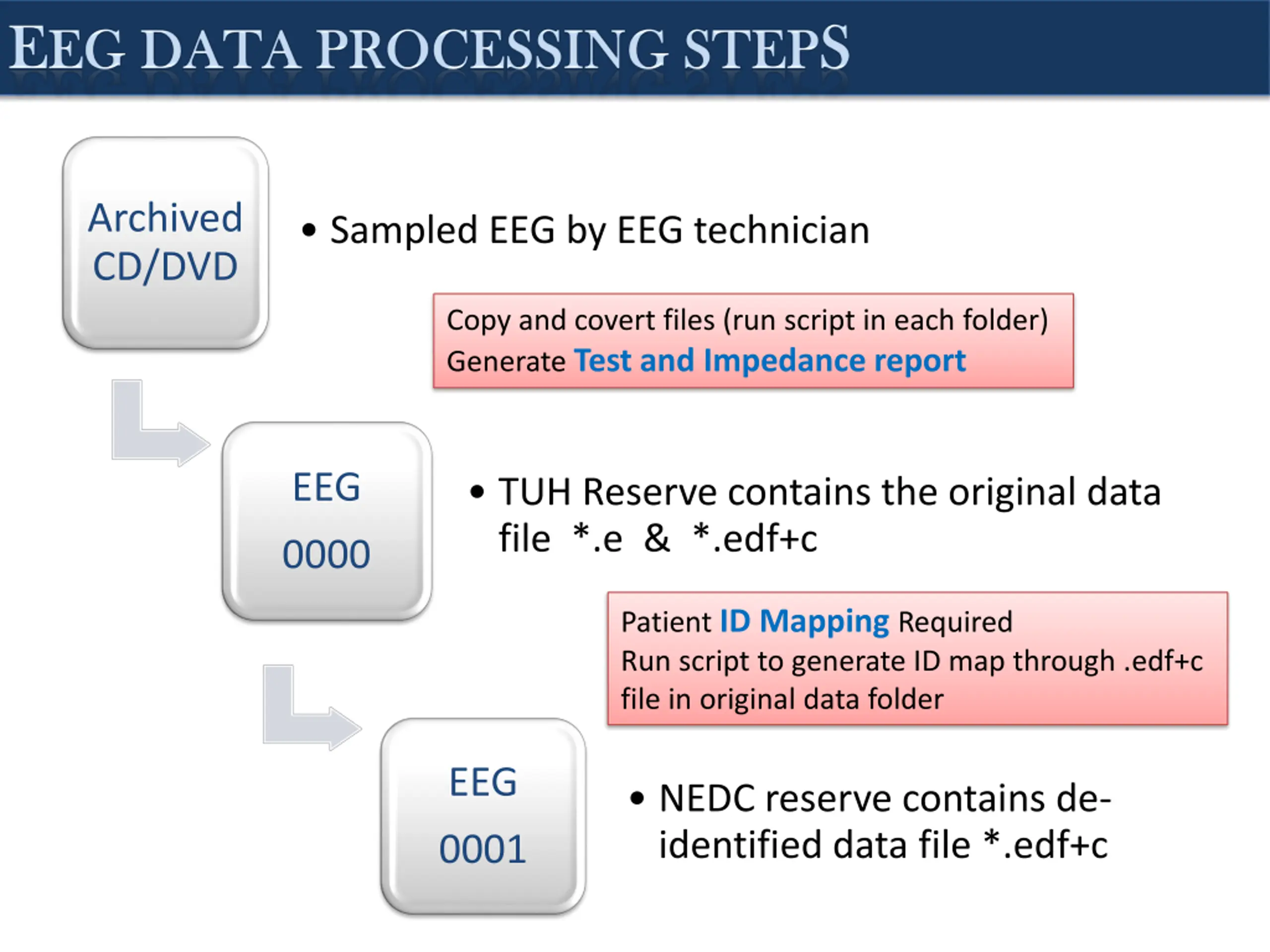 Archived CD/DVD Sampled EEG by EEG technician Copy and covert files (run script in each folder) Generate Test and Impedance report EEG TUH Reserve contains the original data file *.e & *.edf+c 0000 Patient ID Mapping Required Run script to generate ID map through .edf+c file in original data folder EEG NEDC reserve contains de- identified data file *.edf+c 0001